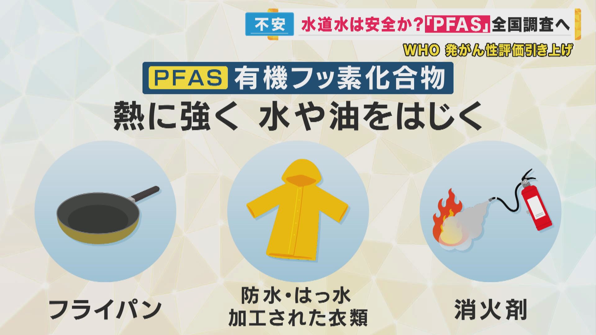 「PFAS」は熱に強く、水や油をはじくなどの特性があり、フライパンのコーティングや、布製品のはっ水加工、消火剤などに使用されてきました。 しかし、世界的に発がん性などが指摘されていて、WHOの専門組織は、昨年、PFASの一部の発がん性について、評価を2段階引き上げ、タバコやアスベストと同じ「発がん性がある」グループに分類。 一方、日本国内ではその発がん性について「証拠は限定的」と評価されていますが、現在はPFASの一部の物質について、輸入や製造が原則禁止されています。