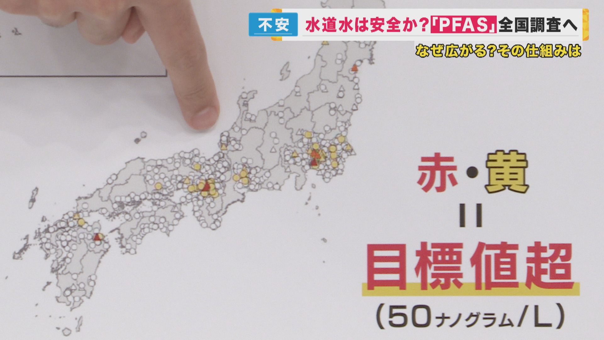 国がまとめたPFASの検出状況で、図の色がついている箇所が、国の目標値を超えている所ですが、関東や関西そして九州など全国的に広がっています。