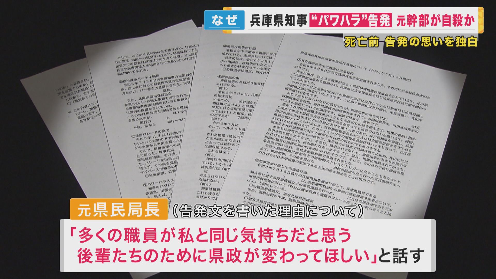 告発文を書いた理由について、元県民局長は、「多くの職員が私と同じ気持ちだと思う。後輩たちのために県政が変わってほしい」と話していました。