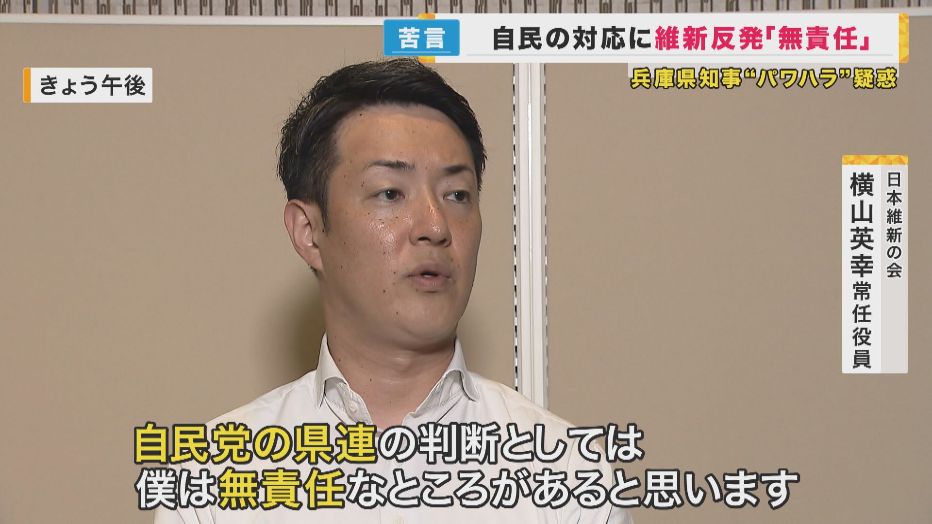 【日本維新の会 横山英幸常任役員】「一部ですね、『維新系首長』と発信されて、維新は推薦していますから、否定するのは責任放棄になると思うが、自民党も推薦したわけ、一部の自民党も。その責任も本来、考えられて、事態を冷静に判断して進められるべき事案だと思います。自民党の県連のご判断としては、僕は無責任なところがあると思います」