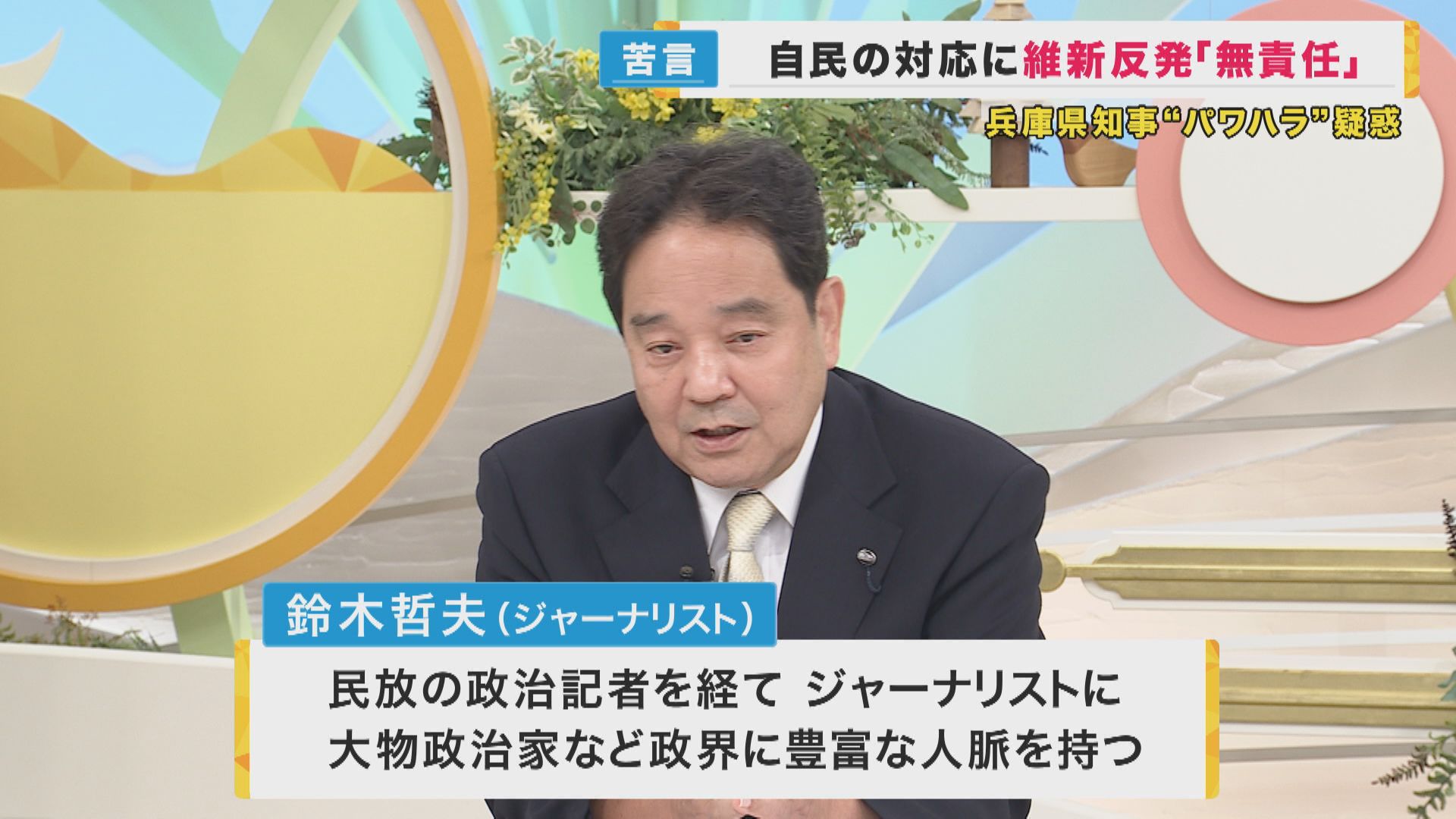 パワハラ疑惑などを文書で告発された兵庫県の斎藤知事に対し、自民党は辞職を含めた対応を取るよう迫っていますが、17日、維新の会からは、自民党は「冷静に判断すべき」で「無責任」との声が上がりました。