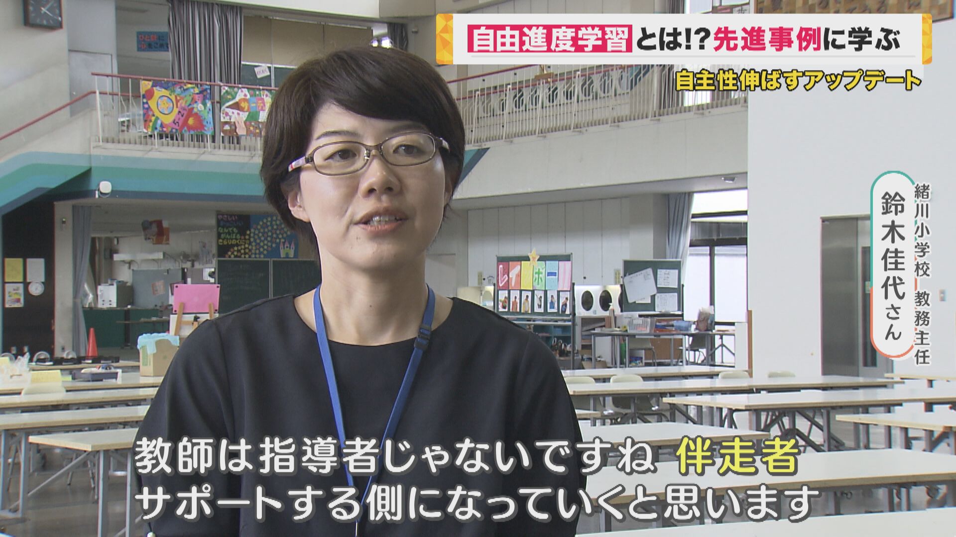 【緒川小学校 教務主任 鈴木佳代さん】「もう教師は指導者ではないですね、伴走者というか。これからはサポートする側になっていくと思います。自分らしく生き生きと生きていくことが必要だといわれる時代になったので、自由進度学習が注目されるようになったのかなと思います」