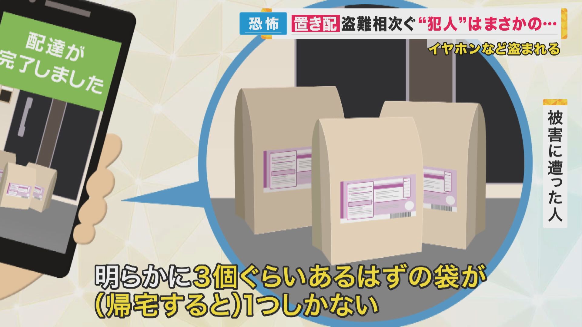 【被害に遭った人】「(仕事中に)メールが来て『配達完了しました』と。写真も一緒に出るんですよ。置かれている写真が。家の前にあるんですけど、明らかに3個ぐらいあるはずの袋が、(帰宅すると)1つしかない。さすがに怒りが湧きました」
