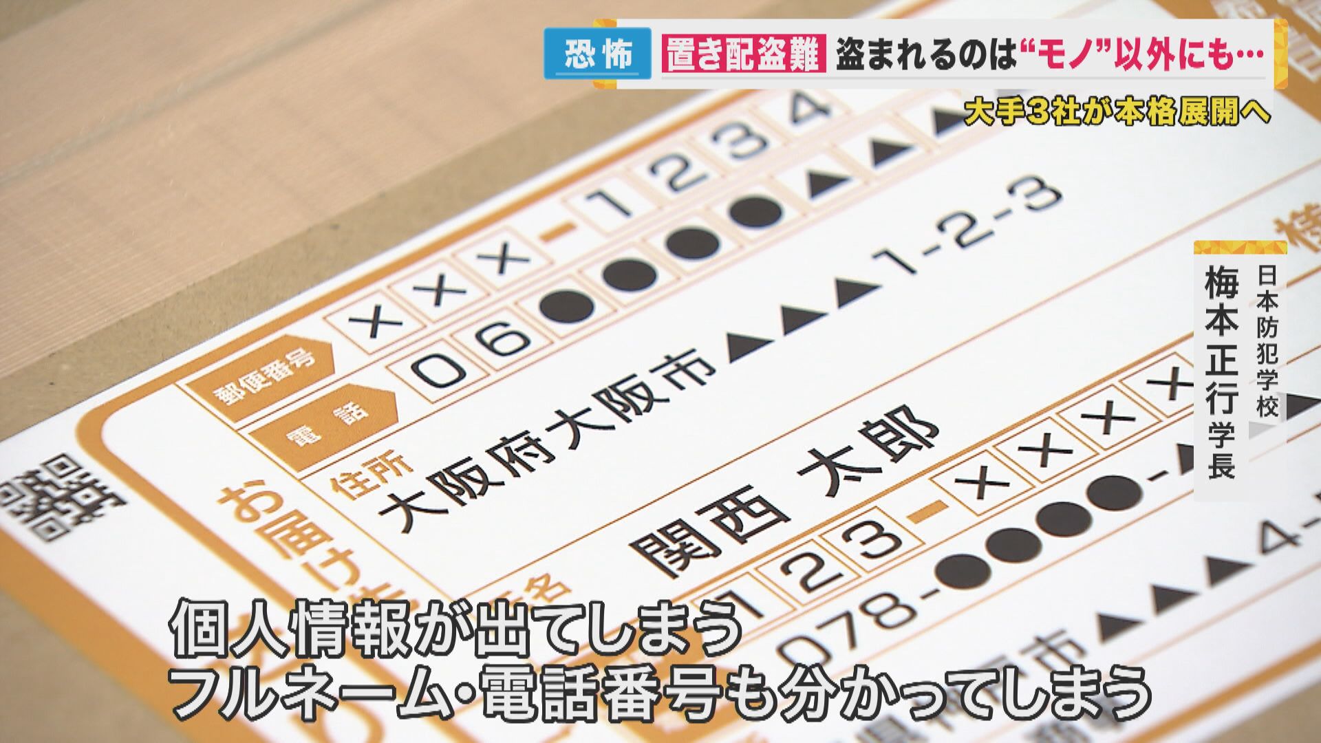 【日本防犯学校 梅本正行学長】「置いてある物を盗んでいくだけですから、人に傷つけたり脅したりする必要がないので、犯罪者からしたら手軽な犯罪。一番怖いのは、置き配をしている人の情報を取られるツールだということ。個人情報が出てしまう。フルネーム、電話番号も分かってしまう。ストーカーまでいったら場合によっては、凶悪犯罪に発展する可能性もあります」