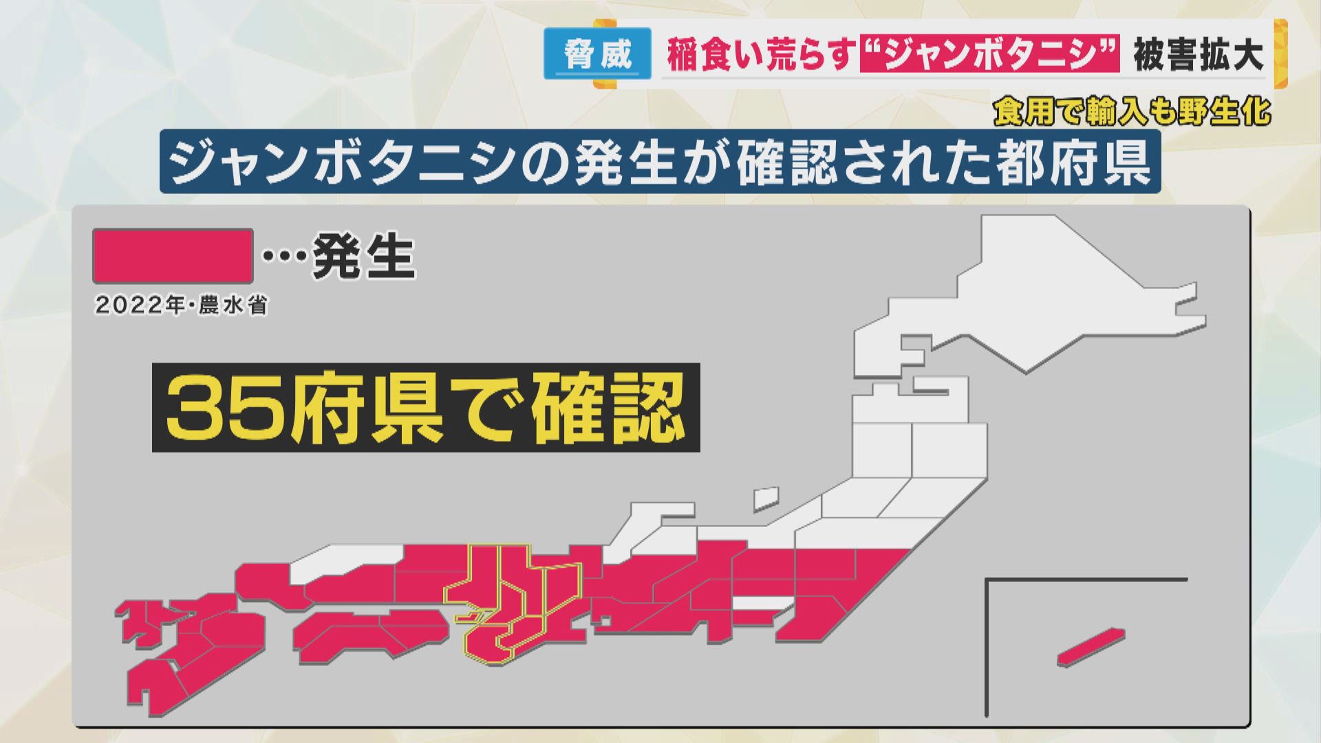 しかし養殖業は衰退し、大量に捨てられたり、逃げ出したりして水田や水路で野生化。 今や「世界の侵略的外来種ワースト100」にも定められているジャンボタニシは、稲の苗を食い荒らし、農家に大きな打撃を与えているのです。 こうした被害は徐々に拡大。2022年時点で関西を含む35府県で生息が確認されているのです。