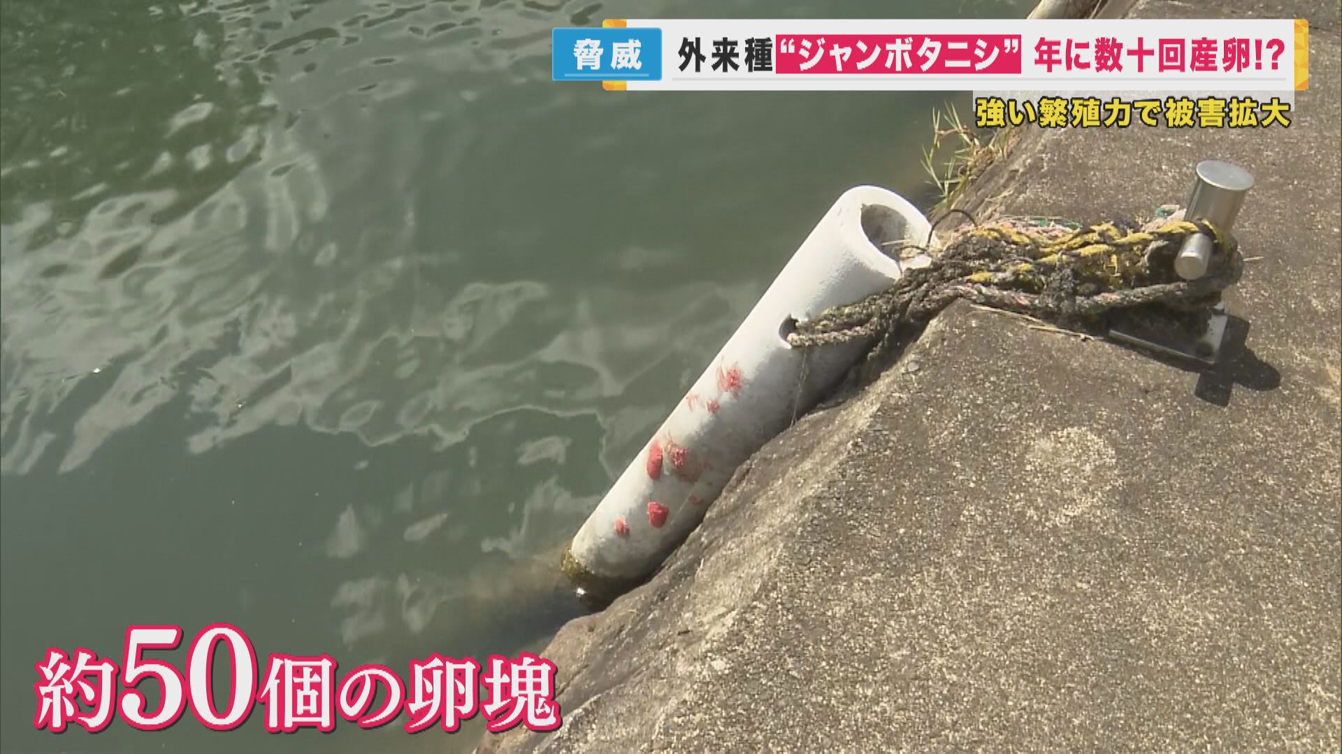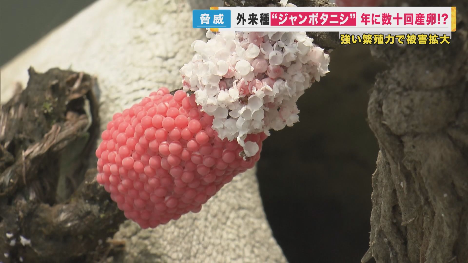 7月28日、琵琶湖から流れる川の岸辺で見つかったのは約50個の卵の塊。1つの塊に200~300個の卵が入っていてこの場所だけで1万個以上になります。そして1年に数十回卵を産むため、繁殖力がかなり強いのです。