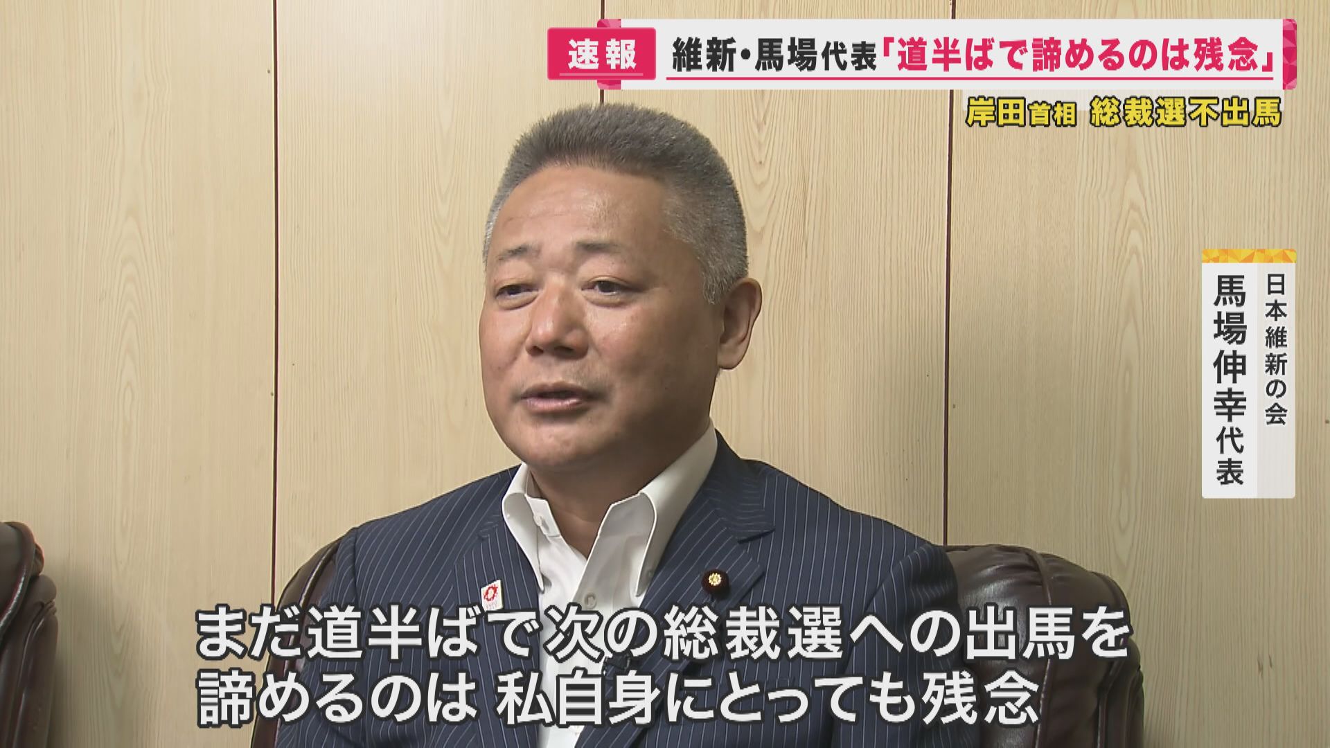 【日本維新の会 馬場伸幸代表】「政治とお金の問題の中で、岸田総理と私が政党間で合意して、必ず国民のみなさん方に納得していただけるような改革をやりましょうと。まだ道半ばで、次の総裁選への出馬を諦めるのは私自身にとっても残念」