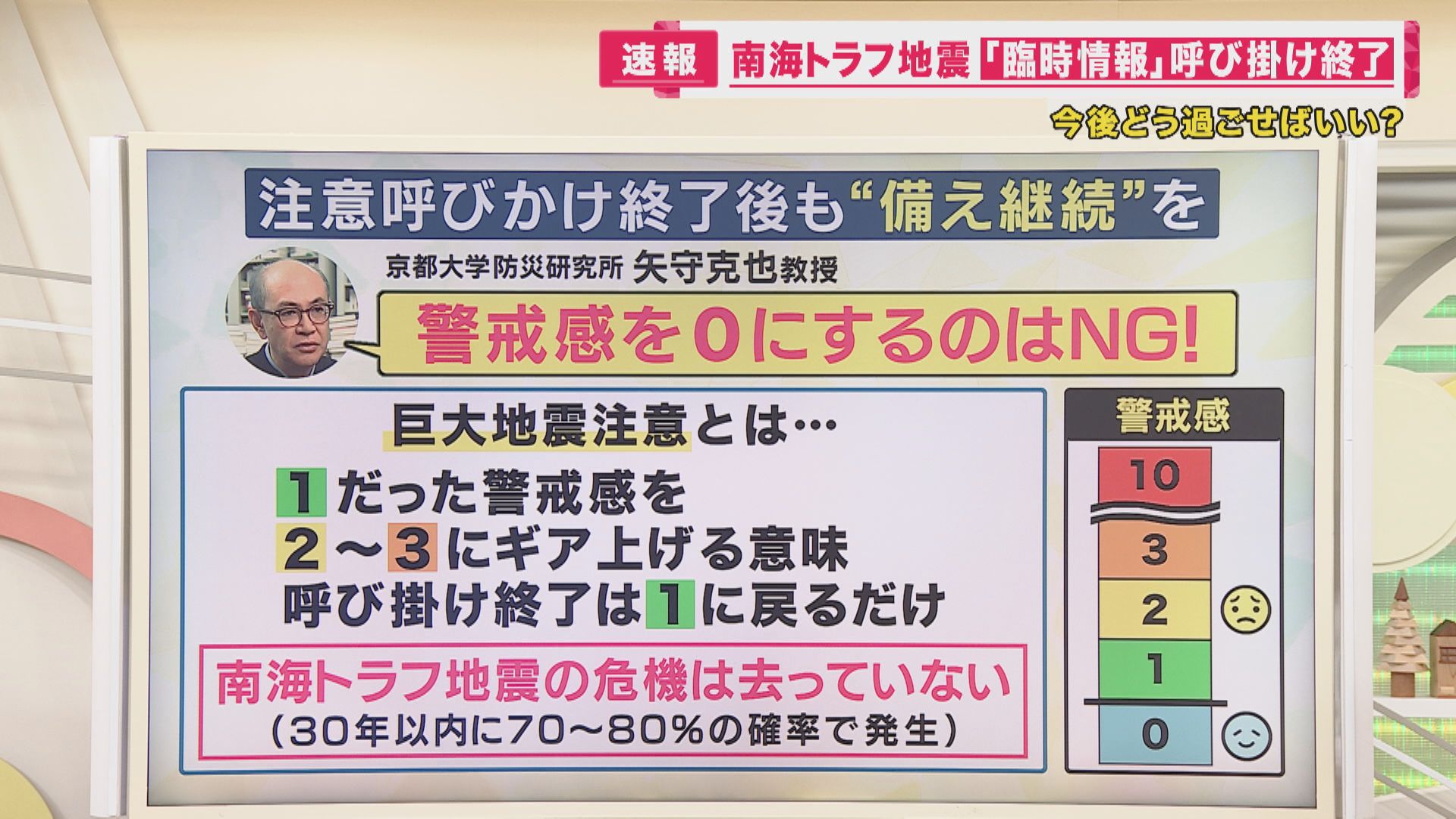 15日午後5時をもって「巨大地震注意」の呼びかけが終了しましたが、私たちはどう生活をしていけばいいのか、専門家に聞きました。 避難行動に詳しい京都大学防災研究所の矢守克也教授によると、「警戒をゼロにするのはNG!」と指摘します。 巨大地震注意とは、「1だった警戒感を、2から3にギアをあげるという意味合いで、呼びかけ終了は1に戻るだけで、今後もゼロにはなりません。30年以内に70%~80%の確率で発生するといわれている、南海トラフ地震の危機はまだ去っていないから」ということです。 警戒のギアを1つ上げたという経験を、今後にも生かしていきたいです。