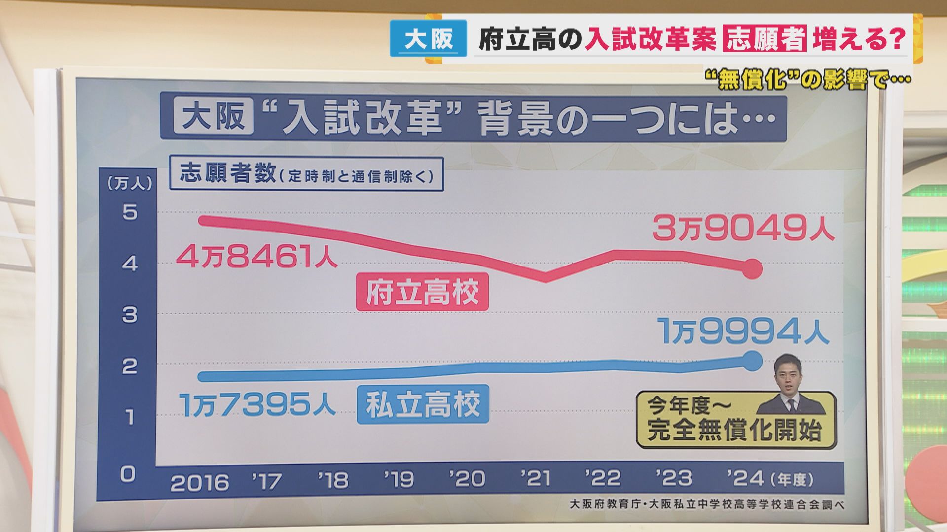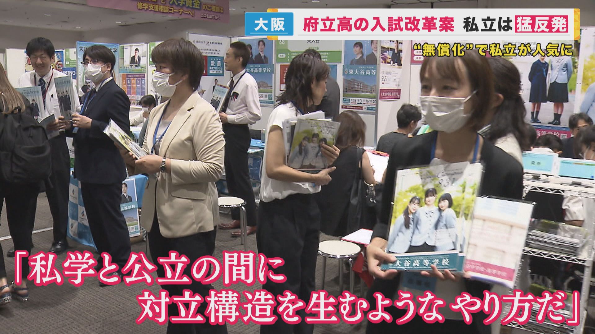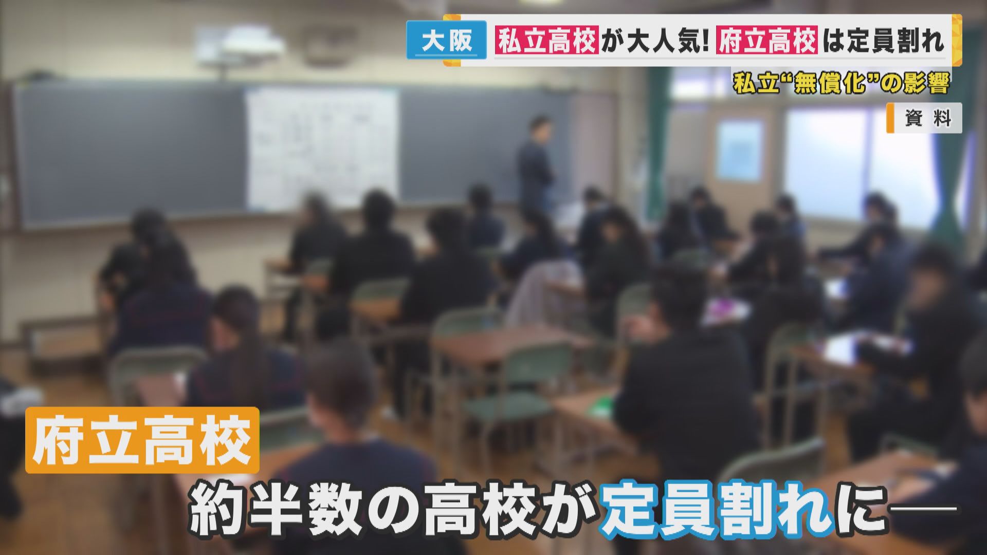 しかし、私立高校が人気を集める一方で、府立高校はことし春の入試でおよそ半数の高校が定員割れする事態に。