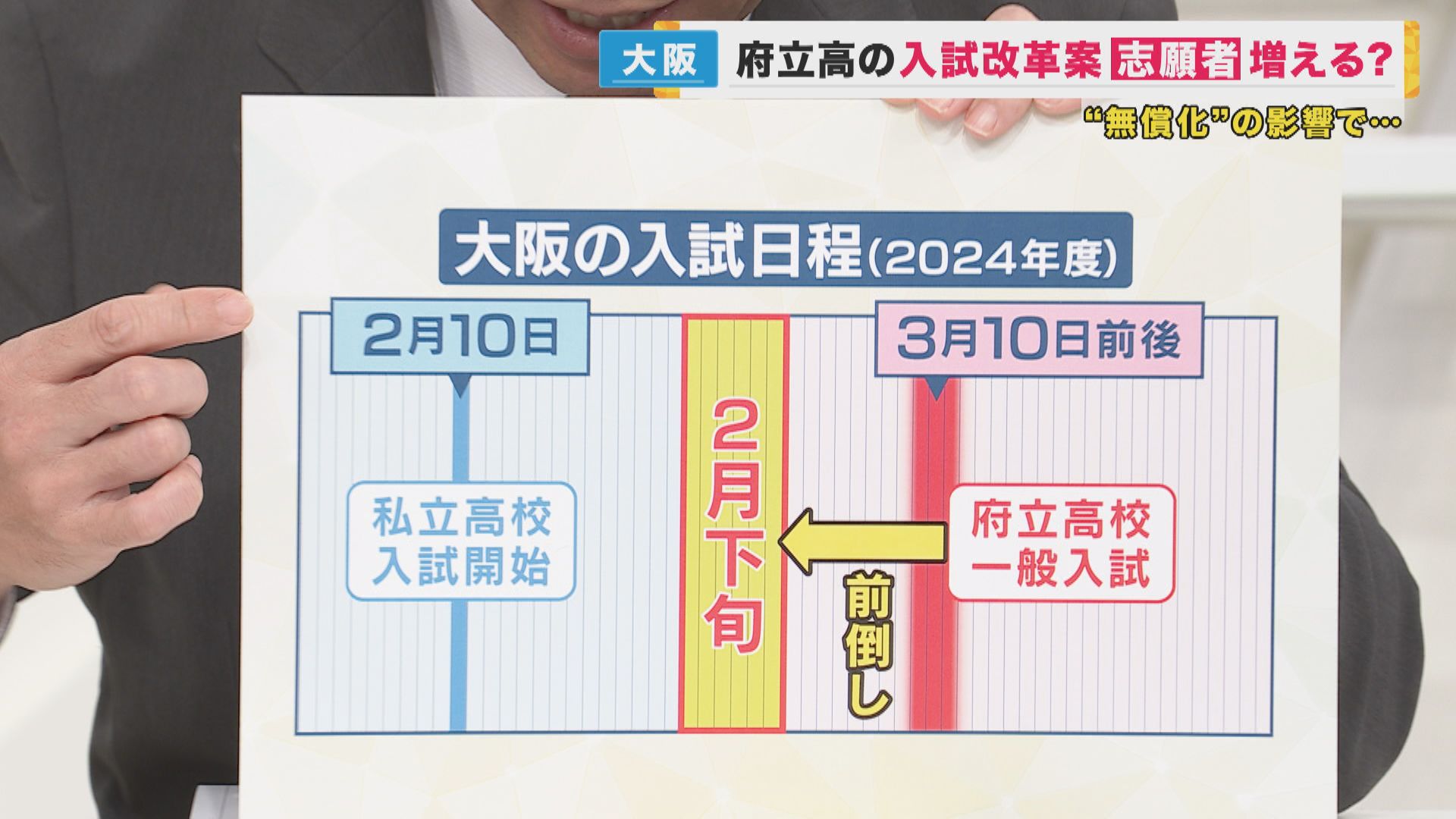 【関西テレビ・神崎博報道デスク】「私立は人気になっていて、府立としては逆転の手を打ちたいというところで、考えられたのが入試の日程です。 これまでは2月10日に入試があり、公立を受けようとしたら、1カ月間受験勉強を続けないといけない。 公立は3月10日前後に試験があるんですね。 私立に決めたら受験勉強を終えて、ゆっくり過ごせるので、私立人気の一翼を担っているようです。 公立側としては、3月の試験を2月下旬にして、私立との試験日の間隔を縮めたら受験勉強を2週間ぐらいなら頑張れるかということで、受験日程を繰り上げる案を考えているみたいです」