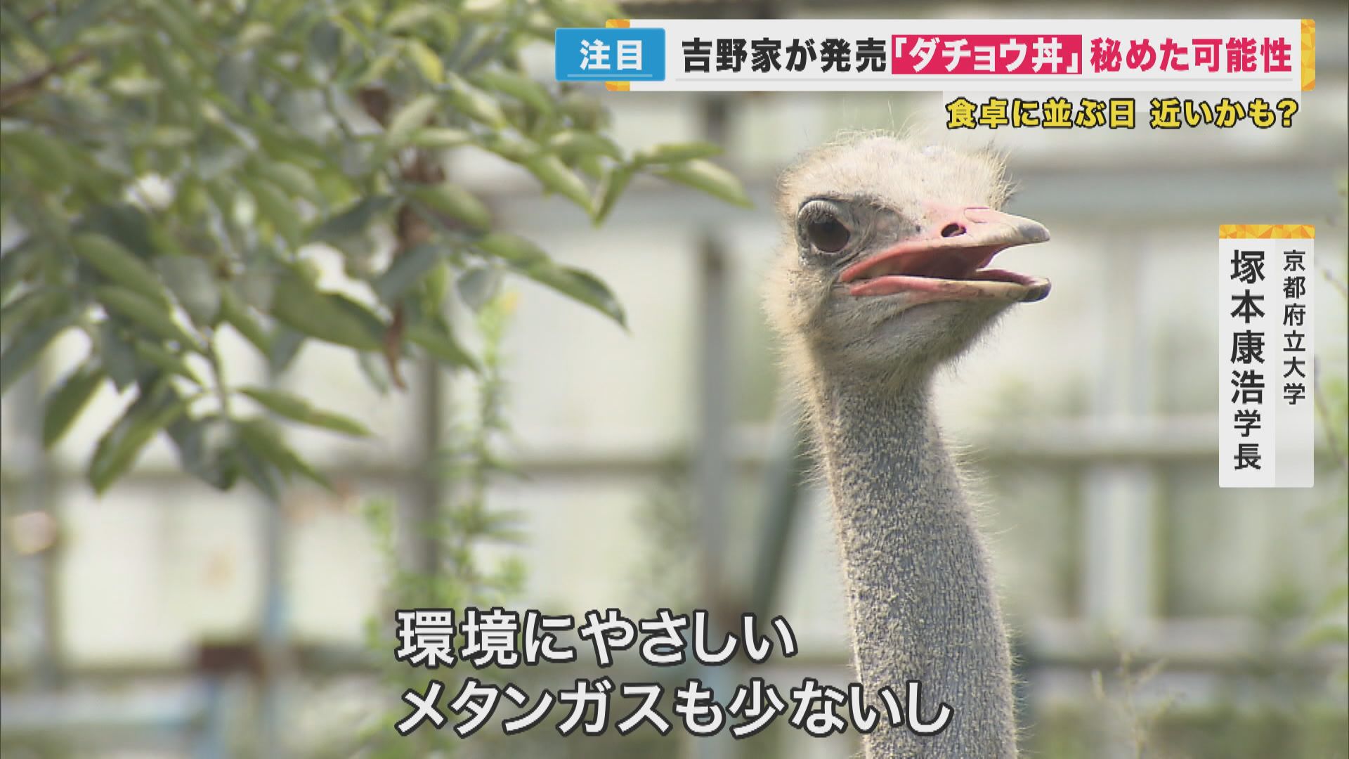 【京都府立大学・塚本康浩学長】「牛や豚は環境にやさしくなかったりするんですね。牛はメタンガスが発生しますし、糞尿処理が大変になる。それに比べると、ダチョウは非常に少ないエサで大きくなるので、環境にやさしい。メタンガスも少ないし、世界レベルの模範となるというか、初めての試みになってくると思うので、非常に期待度、大です」