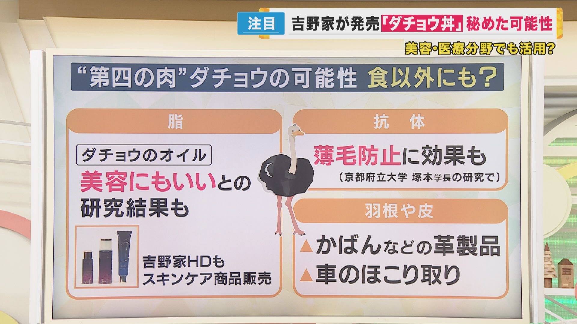 また、京都府立大学の塚本学長によりますと、ダチョウの抗体には薄毛防止の効果が期待されていて、現在、研究が進められているそうです。