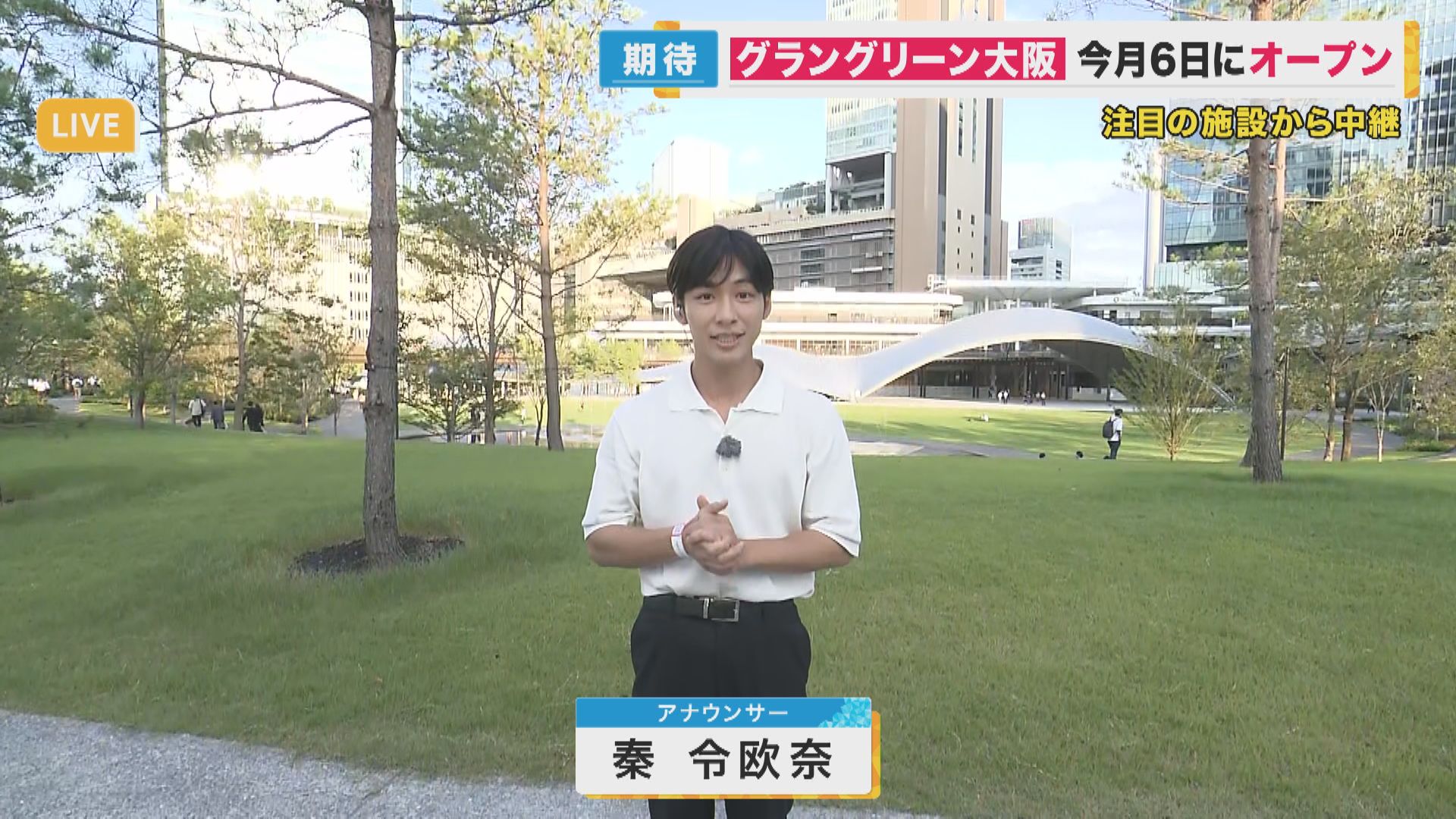 そして、左には、グランフロント大阪があります。 そんな梅田のど真ん中に…こちら、一面に芝生が広がっています。そして、大きな噴水もありまして、見ているだけで心地のいい空間が広がっています。 3日、公開されたのは、今週金曜日に一般公開されるエリアです。このエリアが全体の4割程ということで、北側はまだ工事をしている所もあります。 とはいえ、今回、関西初出店のお店やホテルもオープンするということで、私、この「グラングリーン大阪」を取材してきました。