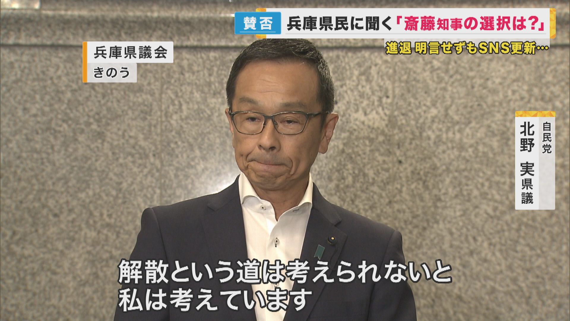 【自民党 北野実県議】「解散というのは、大義がないと思ってますし、まさしく県民に負託を受けた知事でありますが、我々議員も二元代表制として、県民に負託を受けた者86人の総意をもってということでありますので、解散という道は考えられないと私は考えています。あるかなぁ(周囲に聞く)わからないですね」