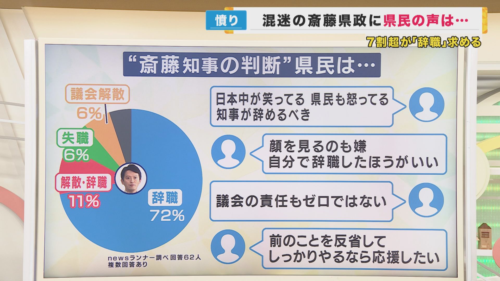番組調べでは、「辞職」72%、「解散・辞職」が11% 「失職」が6% そして「議会の解散」は6%でした。