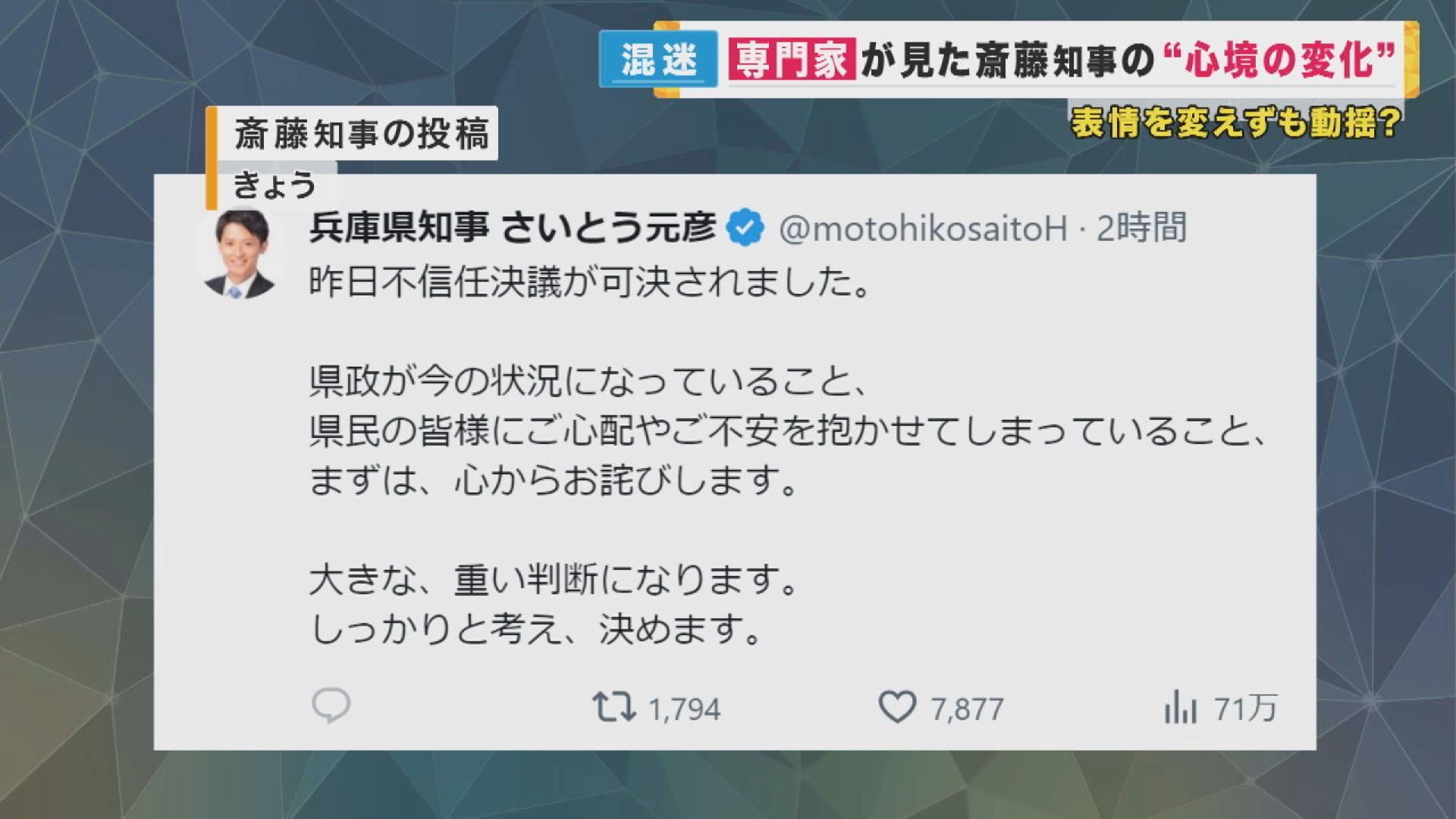 19日、斎藤知事に対する不信任決議が、全会一致で可決。 斎藤知事は自ら「辞職する」か、10日以内に「議会を解散させる」か、「失職する」か選択することになります。 斎藤知事は20日、県庁には出勤しませんでしたが、20日ぶりにエックスを更新。 「大きな、重い判断になります。しっかりと考え、決めます」とつづりました。 議会を解散する場合は、議会事務局に届け出ることが求められますが、20日は、そうした動きはありませんでした。