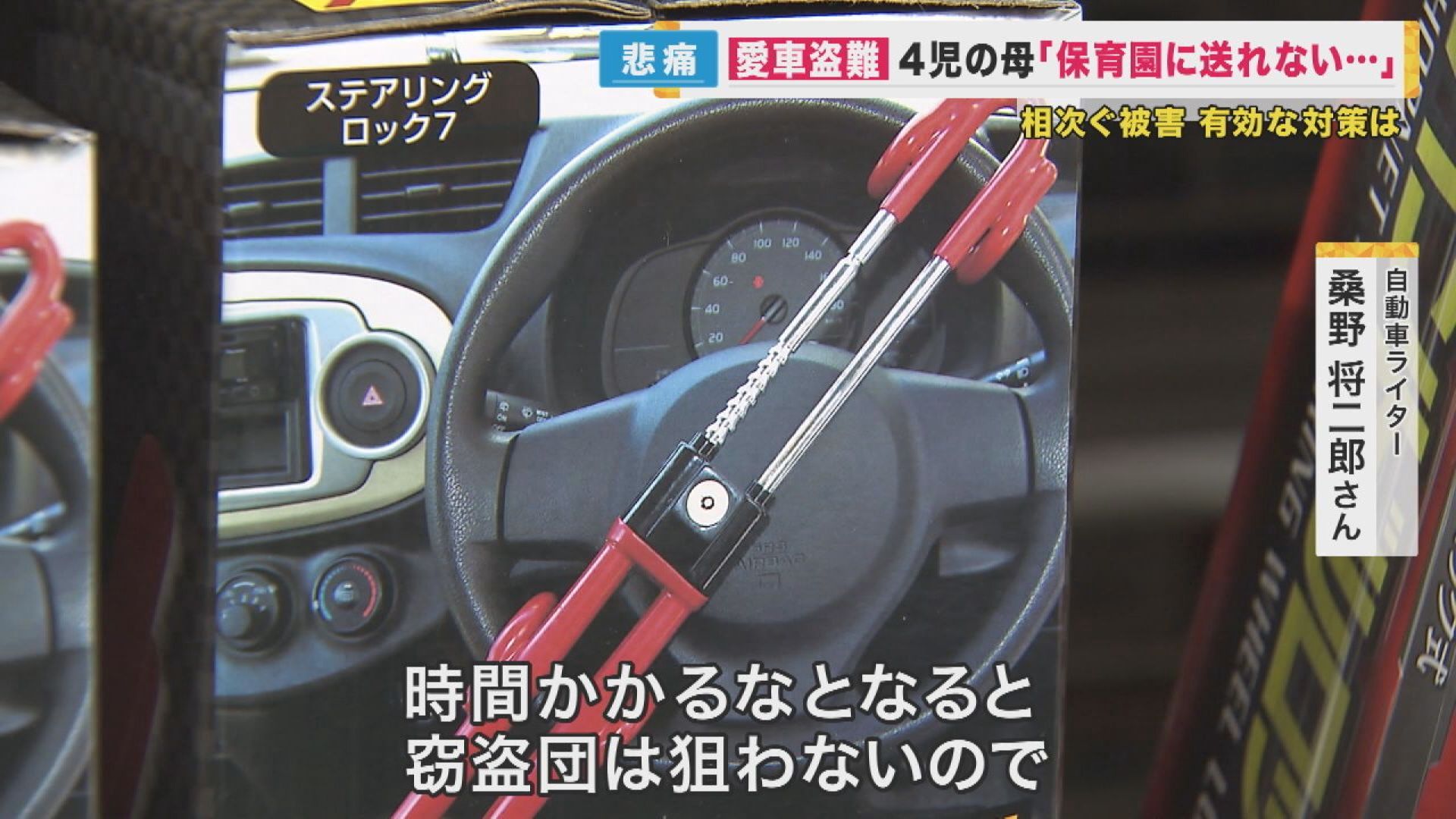 【自動車ライター 桑野将二郎さん】「アナログなやり方なんですが、“ハンドルロック”みたいな、ハンドルが回らなくなる(ようにロックするもの)。あれが実は意外と効果的で、窃盗やる前に窓越しに見て、『時間かかるな』となると窃盗団は狙わないので」