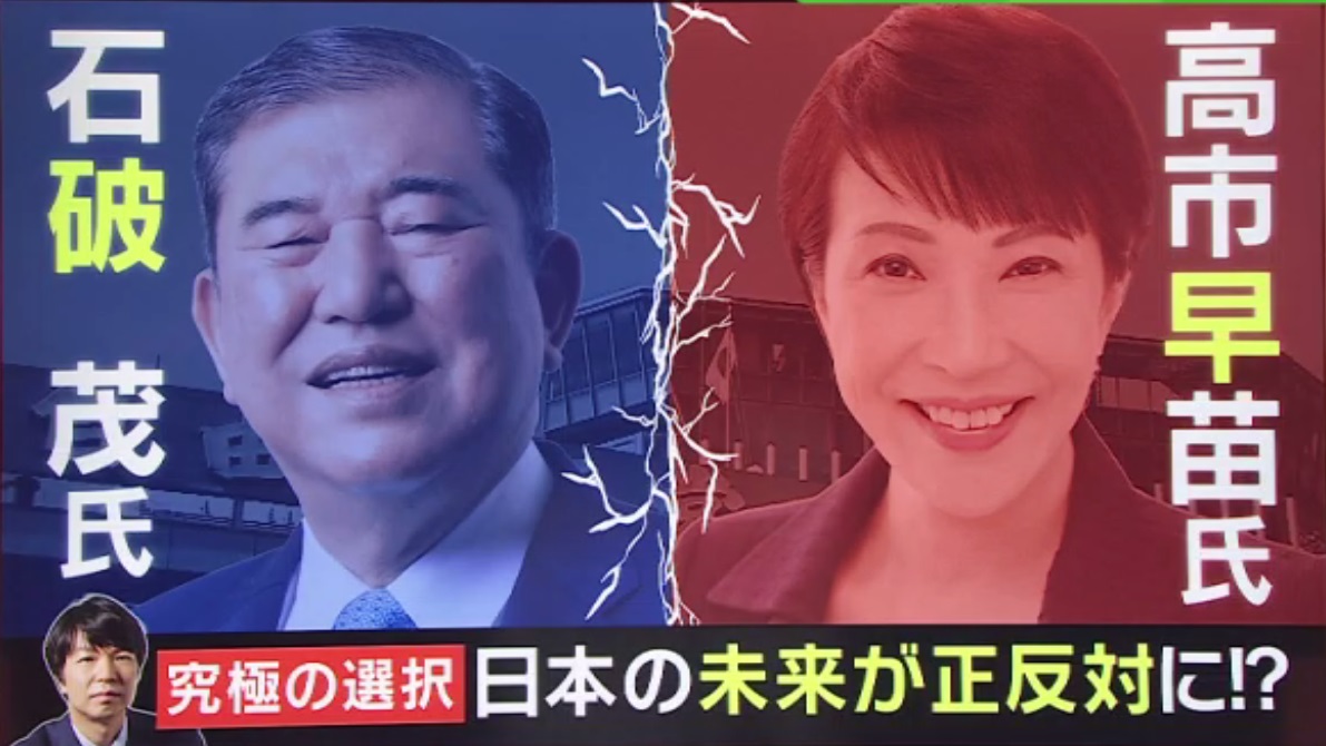 石破氏と高市氏の決選投票になった場合、青山氏は「究極の選択。日本の未来が正反対に!?」と表現します。