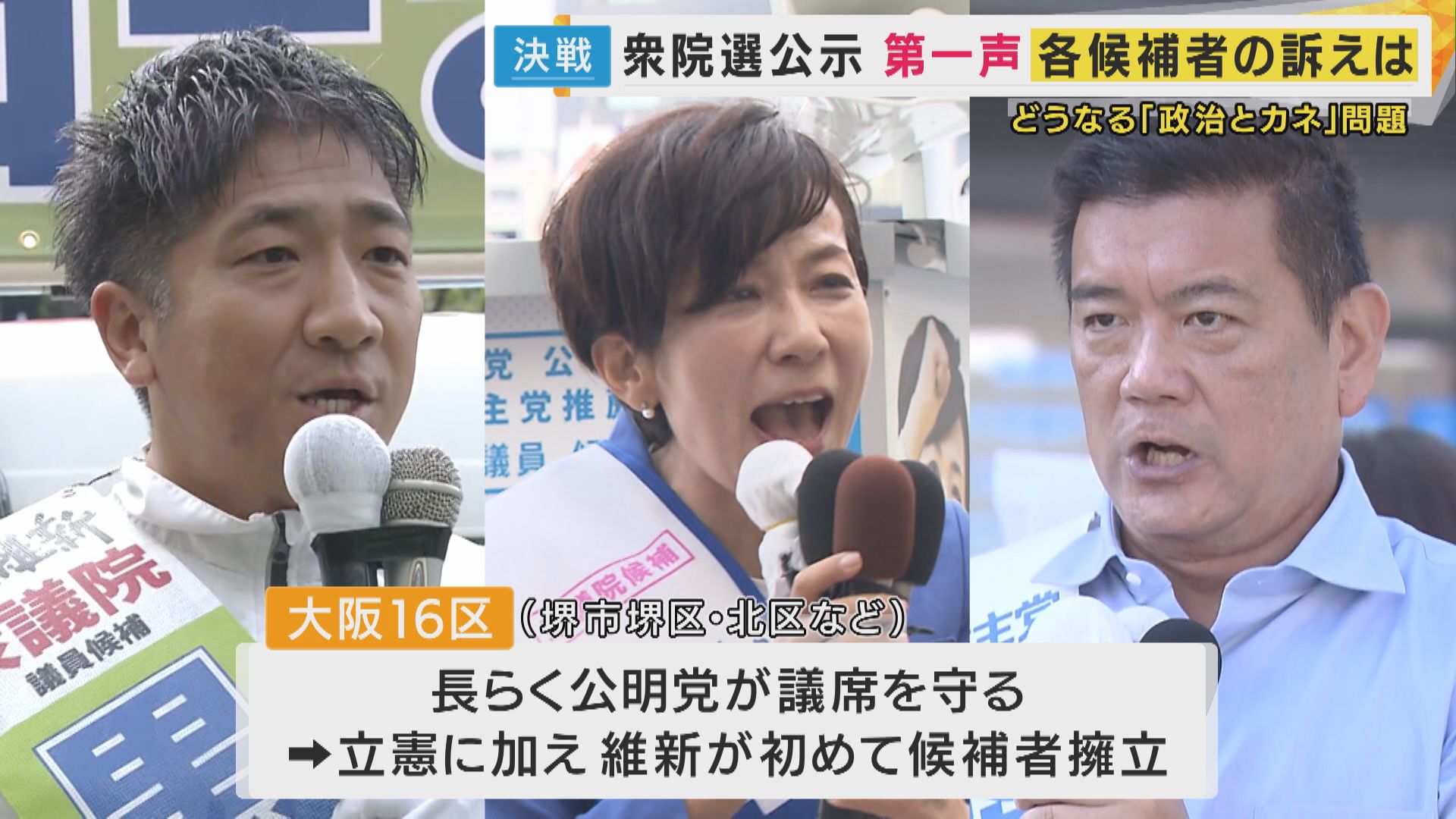 一方、堺市堺区、北区、東区をエリアとする大阪16区は、長らく公明党が議席を守ってきましたが、立憲に加え、これまで候補者を擁立してこなかった維新が初めて候補者を立て、全面対決となります。
