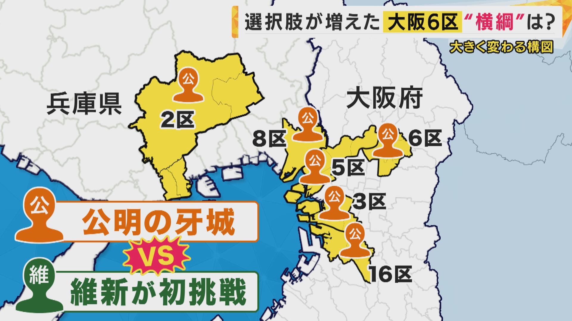 今回大きく構図が変わるのが、大阪、兵庫の6つの選挙区です。