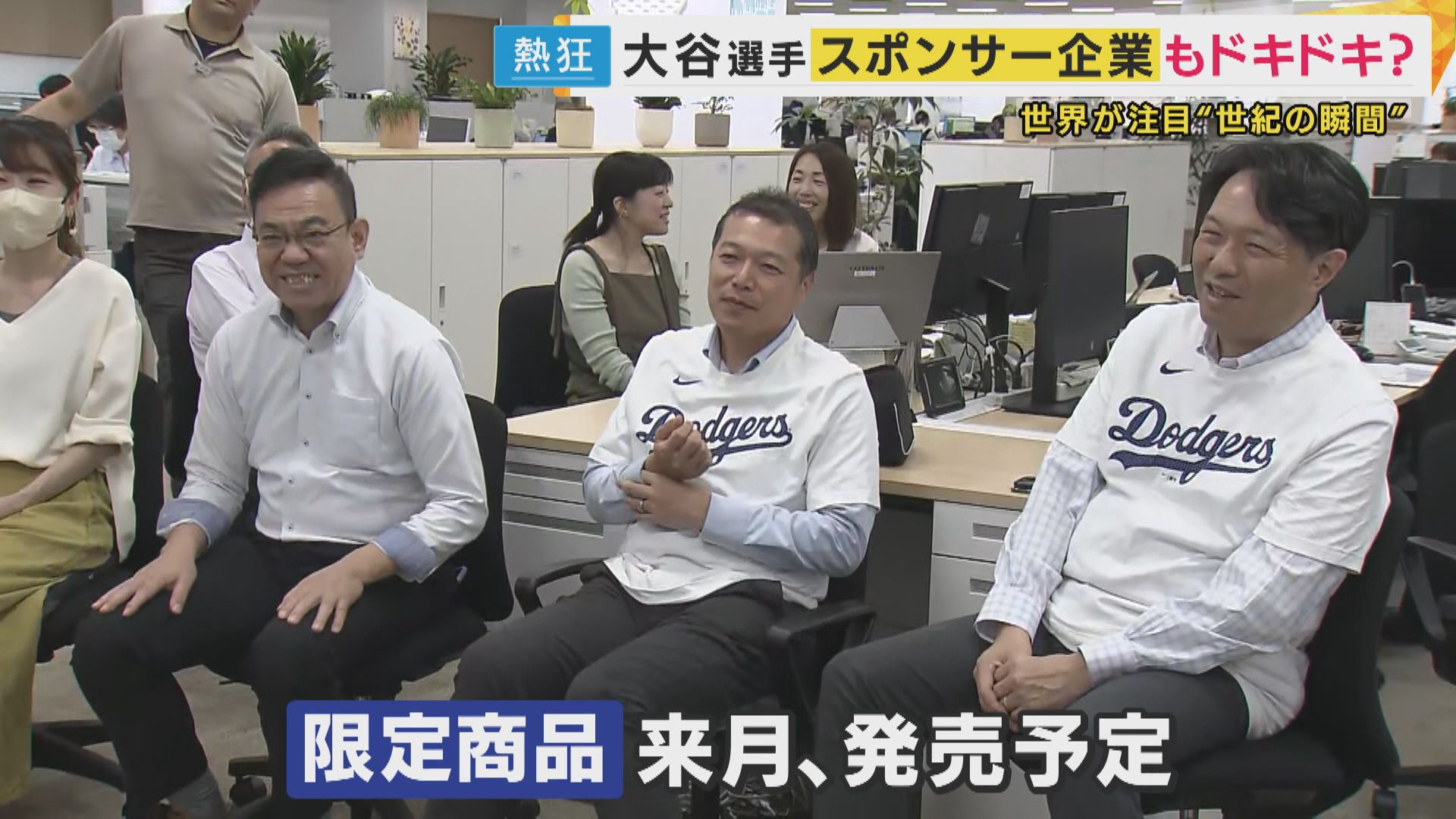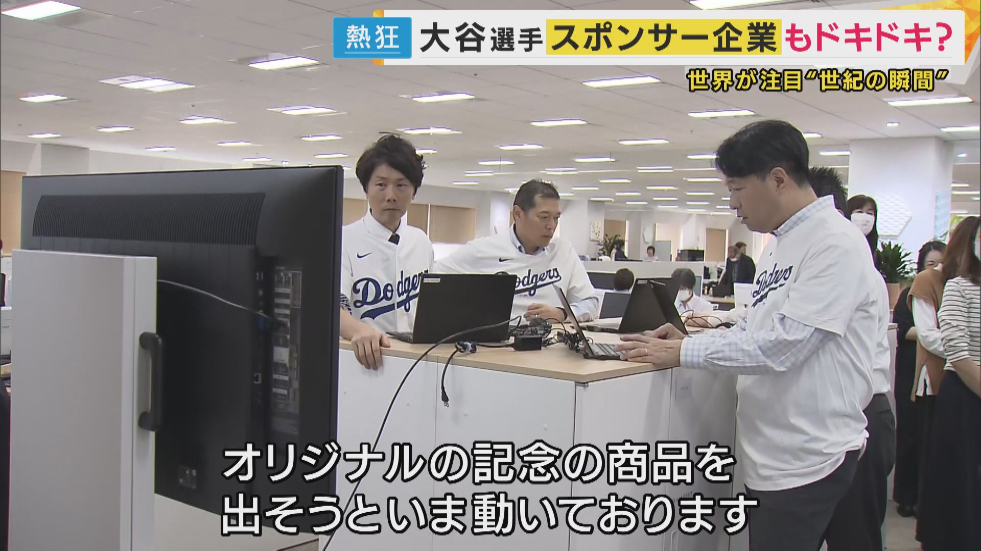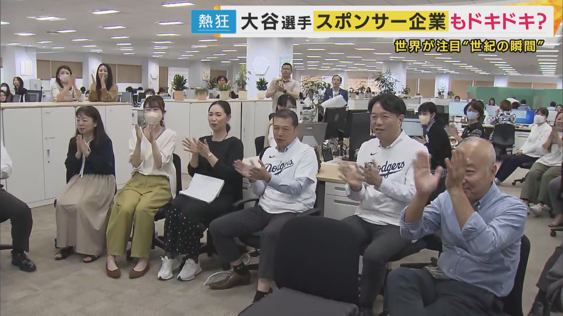 営業中のオフィスでドジャースの活躍に歓喜する社員たち。