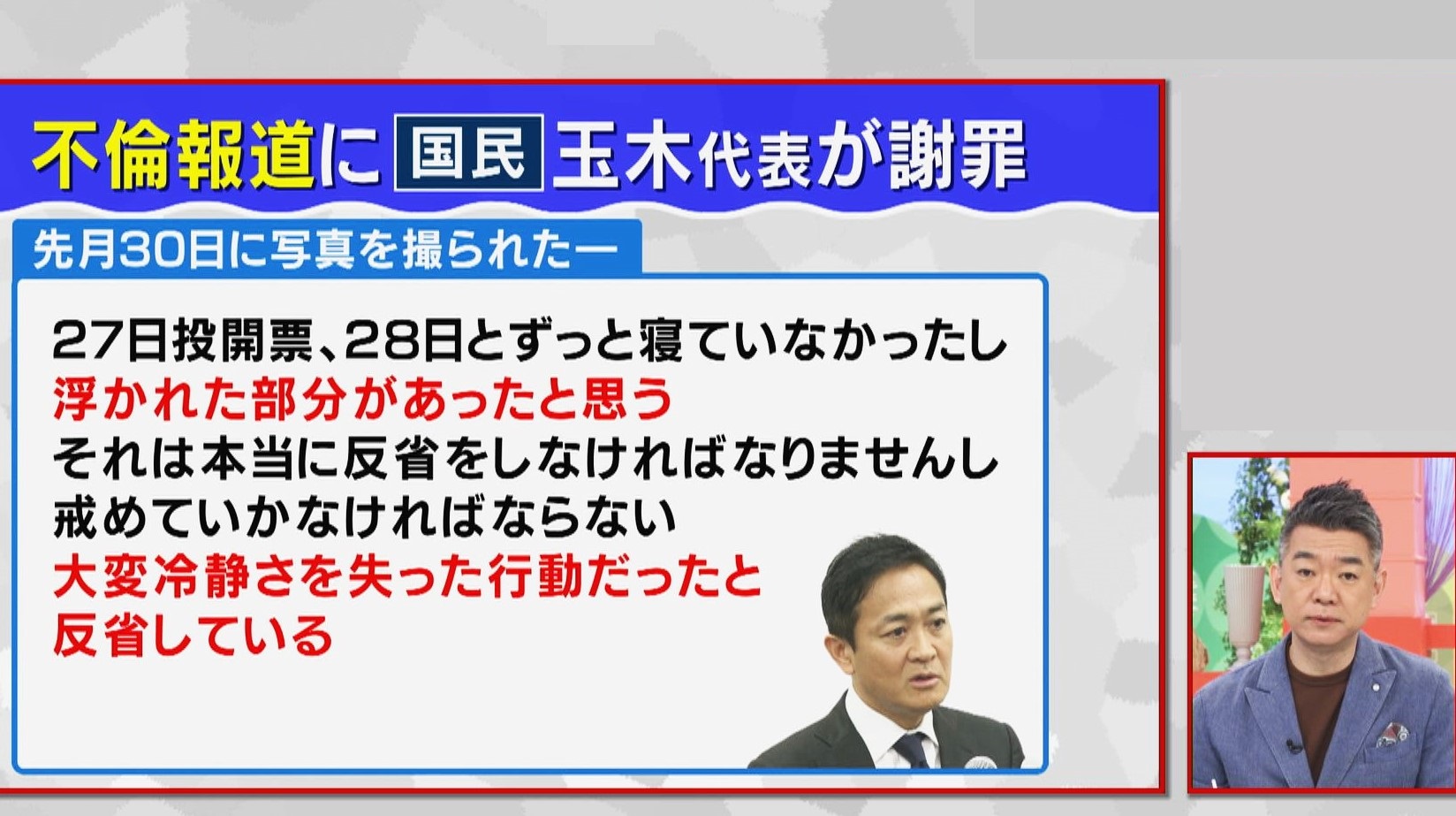 10月30日に写真を撮られたことについて、玉木代表は、「27日投開票、28日とずっと寝ていなかったし、浮かれた部分があったと思う。それは本当に反省をしなければなりませんし、戒めていかなければならない。大変冷静さを失った行動だったと反省している」と話しています。