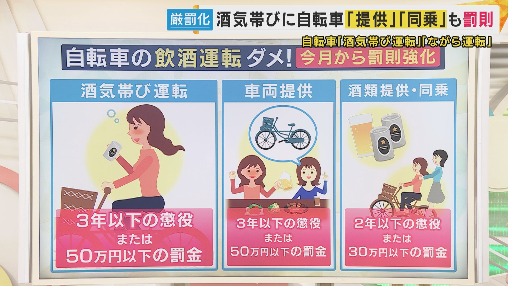 自転車への罰則については11月から、「酒気帯び運転」に対する罰則が新たに設けられ、3年以下の懲役、または50万円以下の罰金が科せられることになりました。 運転者だけではなく、酒を飲んだ状態で乗ることを知りながら自転車を貸したり、2人乗りや酒類の提供も罰則の対象となっています。