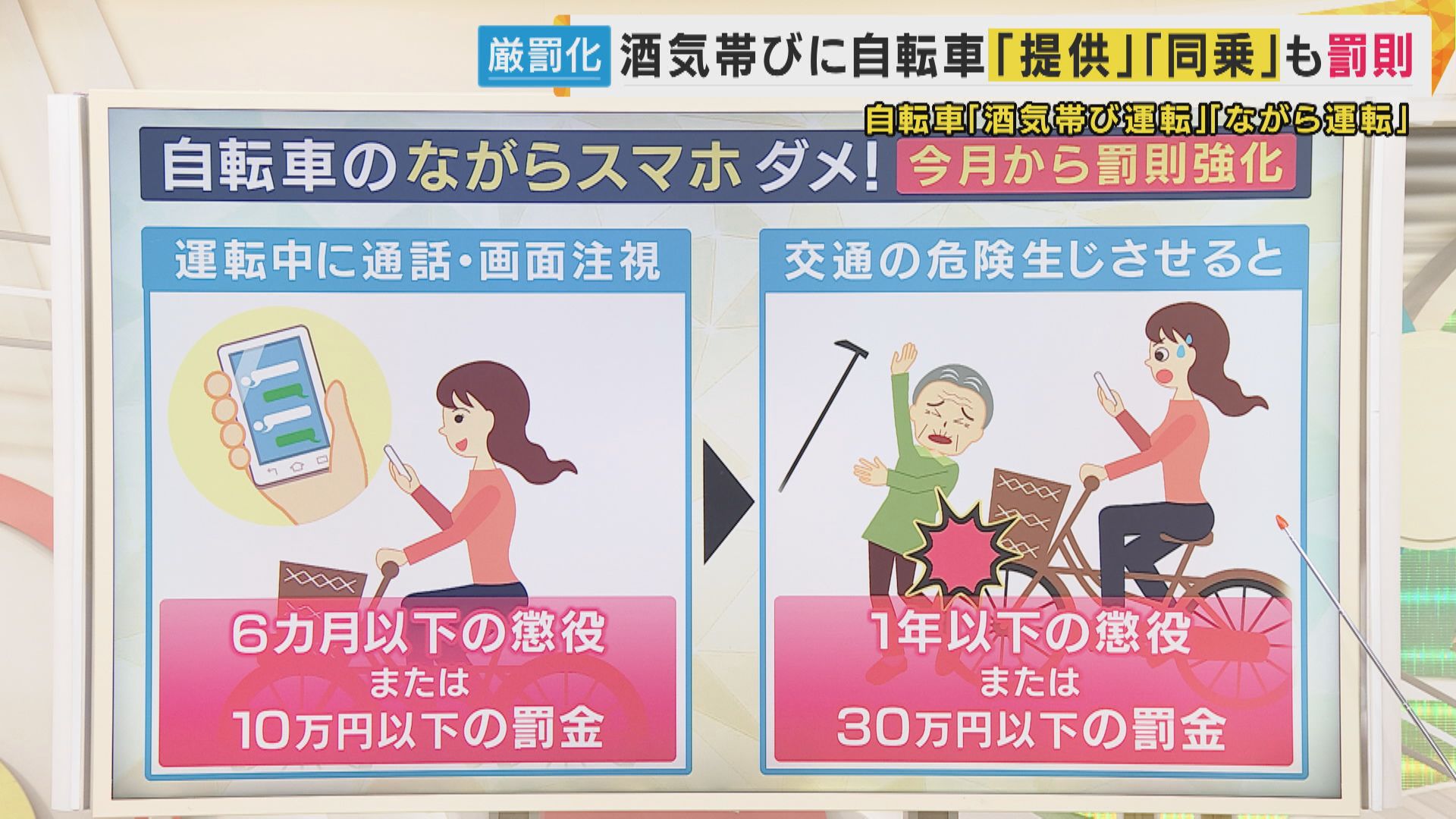 こうした中、11月1日から道路交通法が改正され、自転車での「酒気帯び運転」や、スマートフォンを見たり通話しながらの「ながら運転」などの罰則が強化されました。