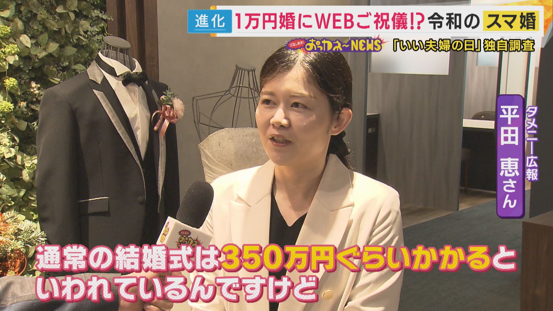 【タメニー広報 平田恵さん】「通常の結婚式は350万円ぐらいかかると言われているんですけど、スマ婚で挙げていただくと、半額以下で実施いただくことが可能」