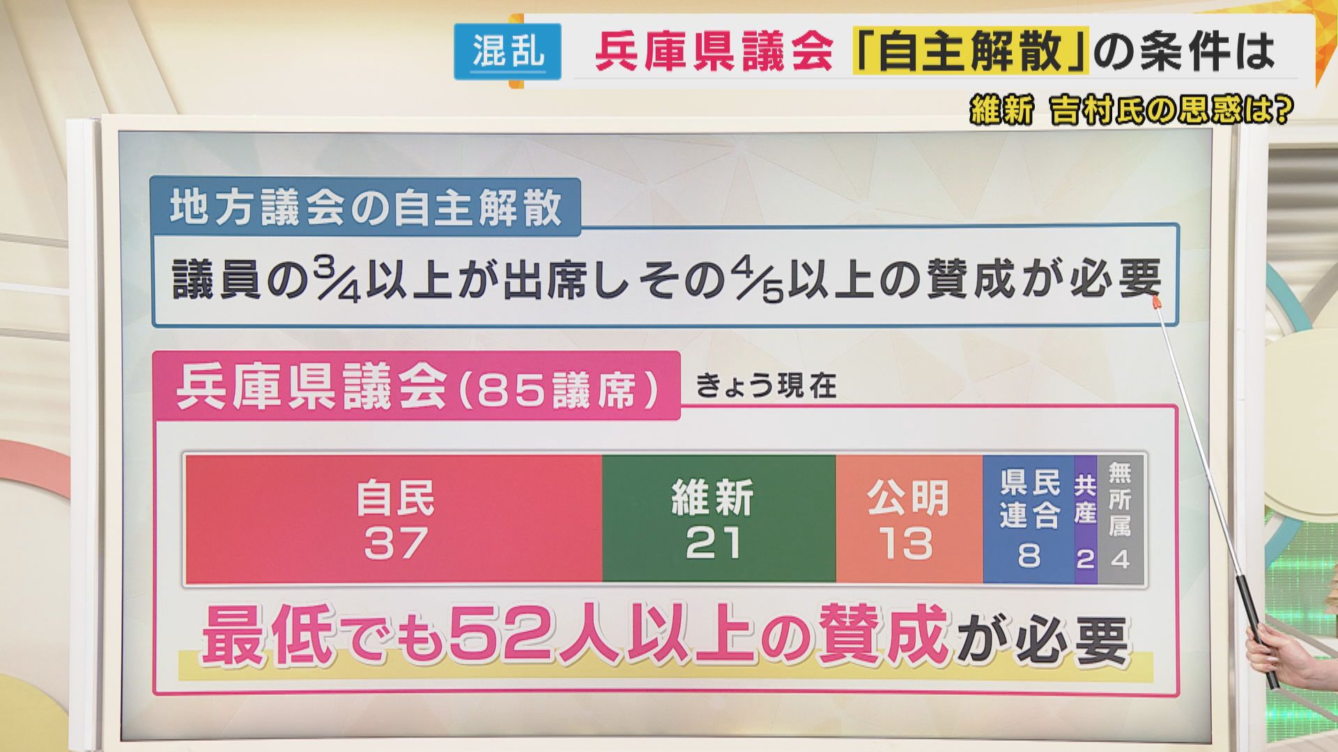 兵庫県議会は、26日現在、85議席なので、最低でも52人以上の賛成が必要となります。