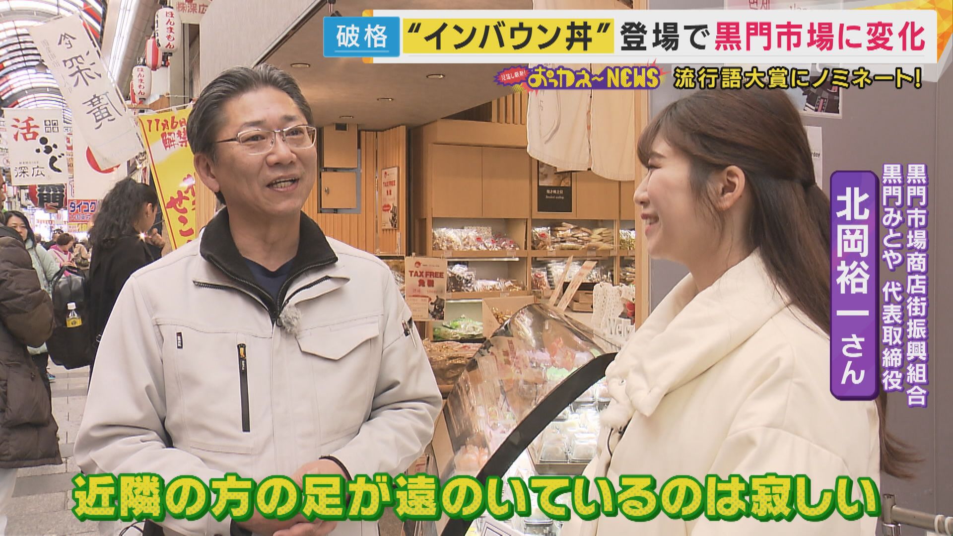 【黒門みとや代表取締役 北岡裕一さん】「昔からの店は何も変わらず商売しているんですけど、閉まったお店に新しく外国資本のお店が入ってきて、商店街組合にも入らず、好き放題に高い値段をつけて商売しているところも実際あります。今現在、9:1です。外国人の方が9割。世界から来ていただくのは喜ばしいこと。あまりにも多すぎて近隣の方の足が遠のいているのは寂しい」