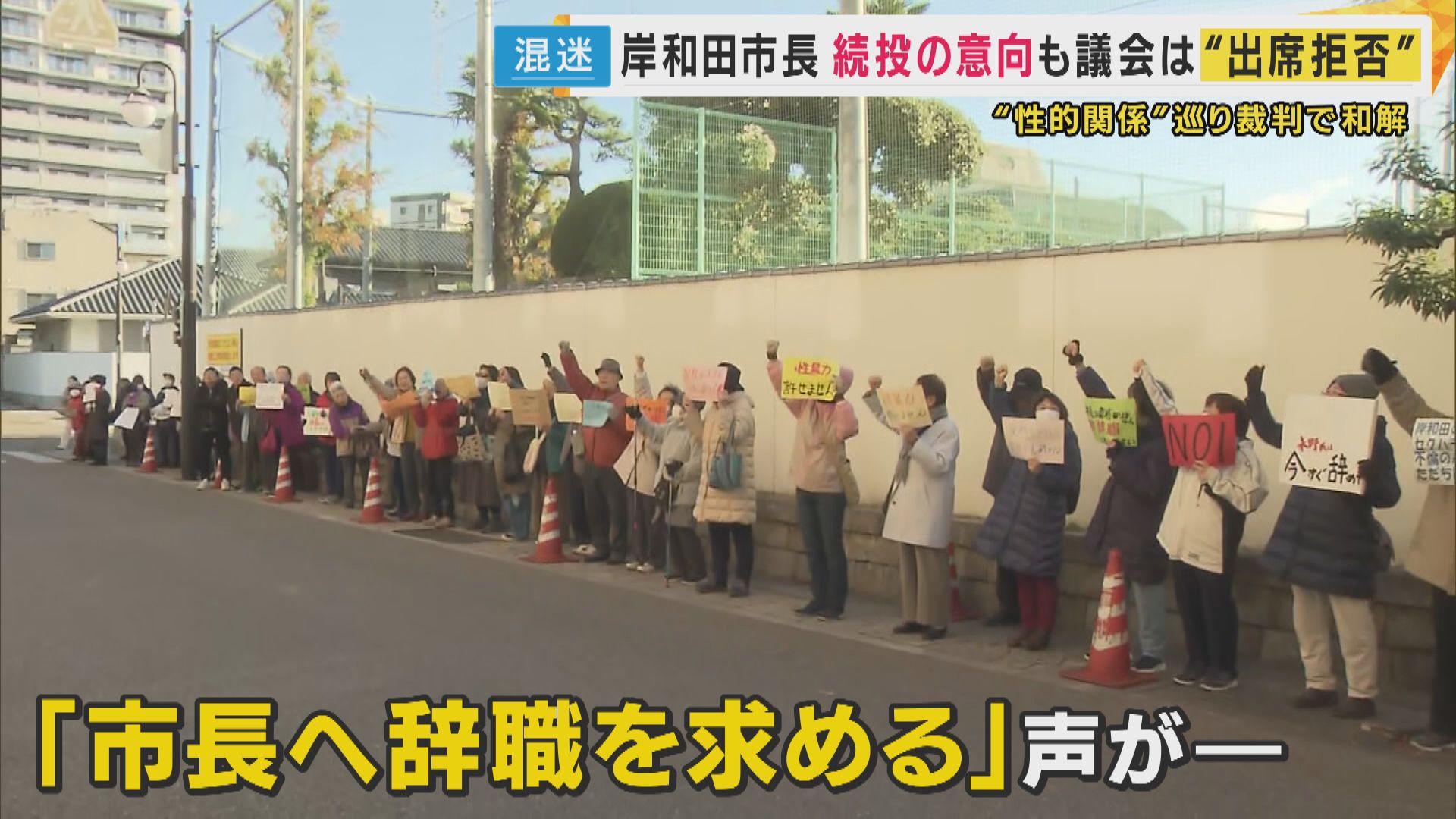 9日朝、岸和田市役所前では「市長へ辞職を求める」シュプレヒコールが起きる事態に…。