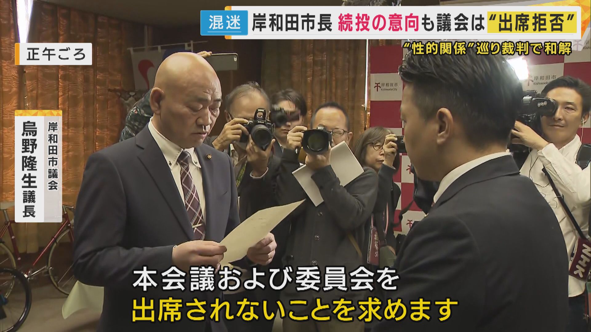 【岸和田市議会 烏野隆生議長】「本会議および委員会を出席されないことを求めます。これは議会の総意です」