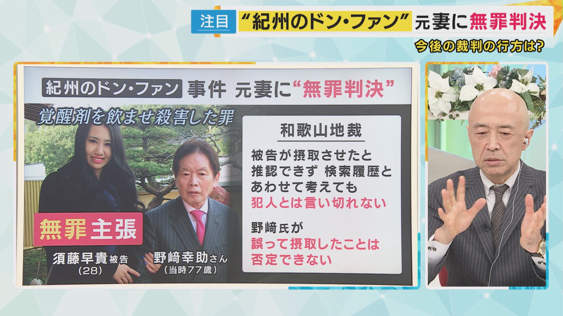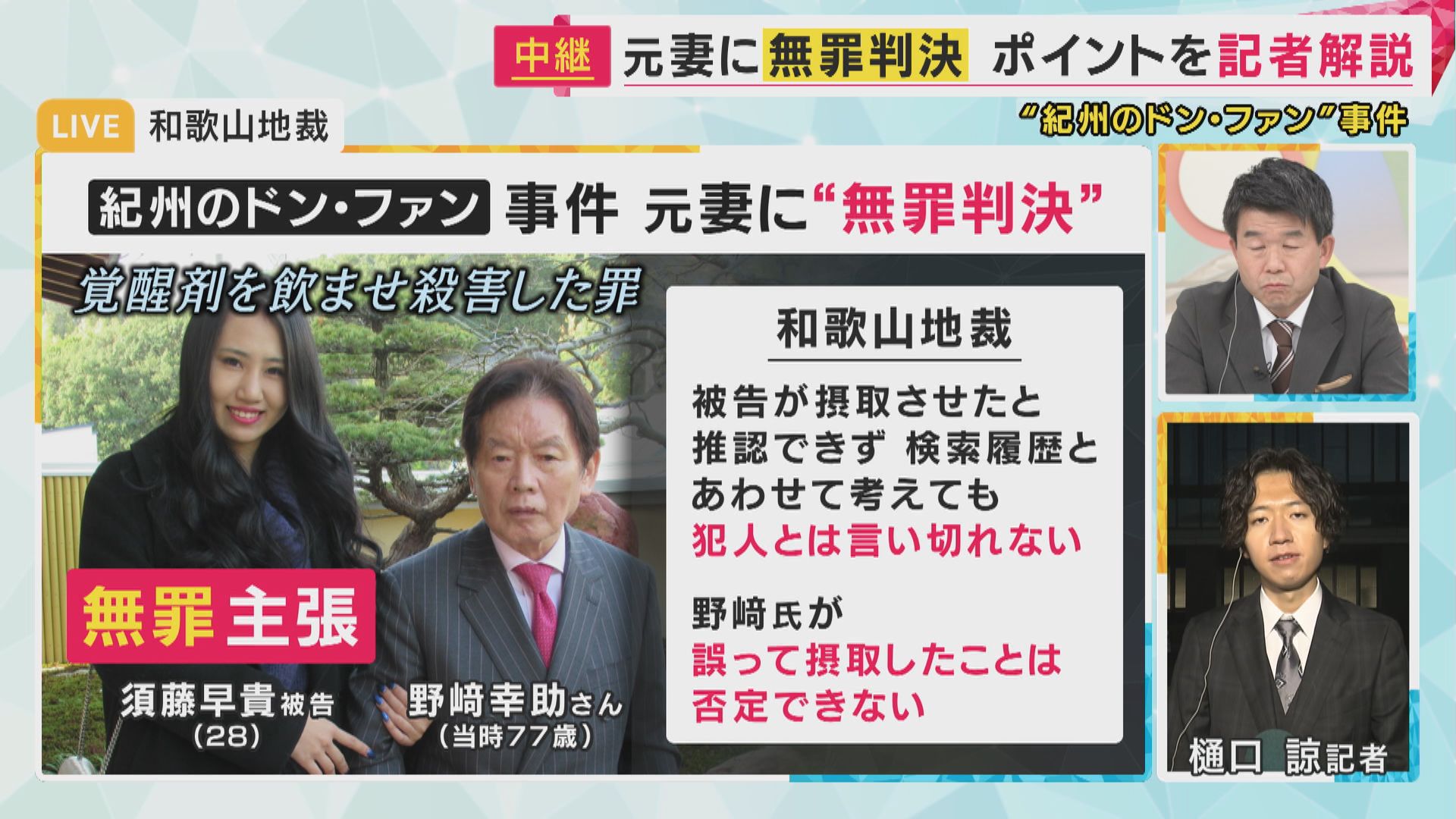 【関西テレビ 樋口諒記者】「12日、和歌山地裁は須藤被告に無罪を言い渡しました。判決を言い渡されるとき、須藤被告はまっすぐと裁判長の方を向いていましたが、その後、目を下に落とし、弁護人がハンカチを手渡すと、須藤被告のすすり泣く声が法廷に聞こえました。そして最後、須藤被告は裁判長に一礼をして法廷を後にしました」