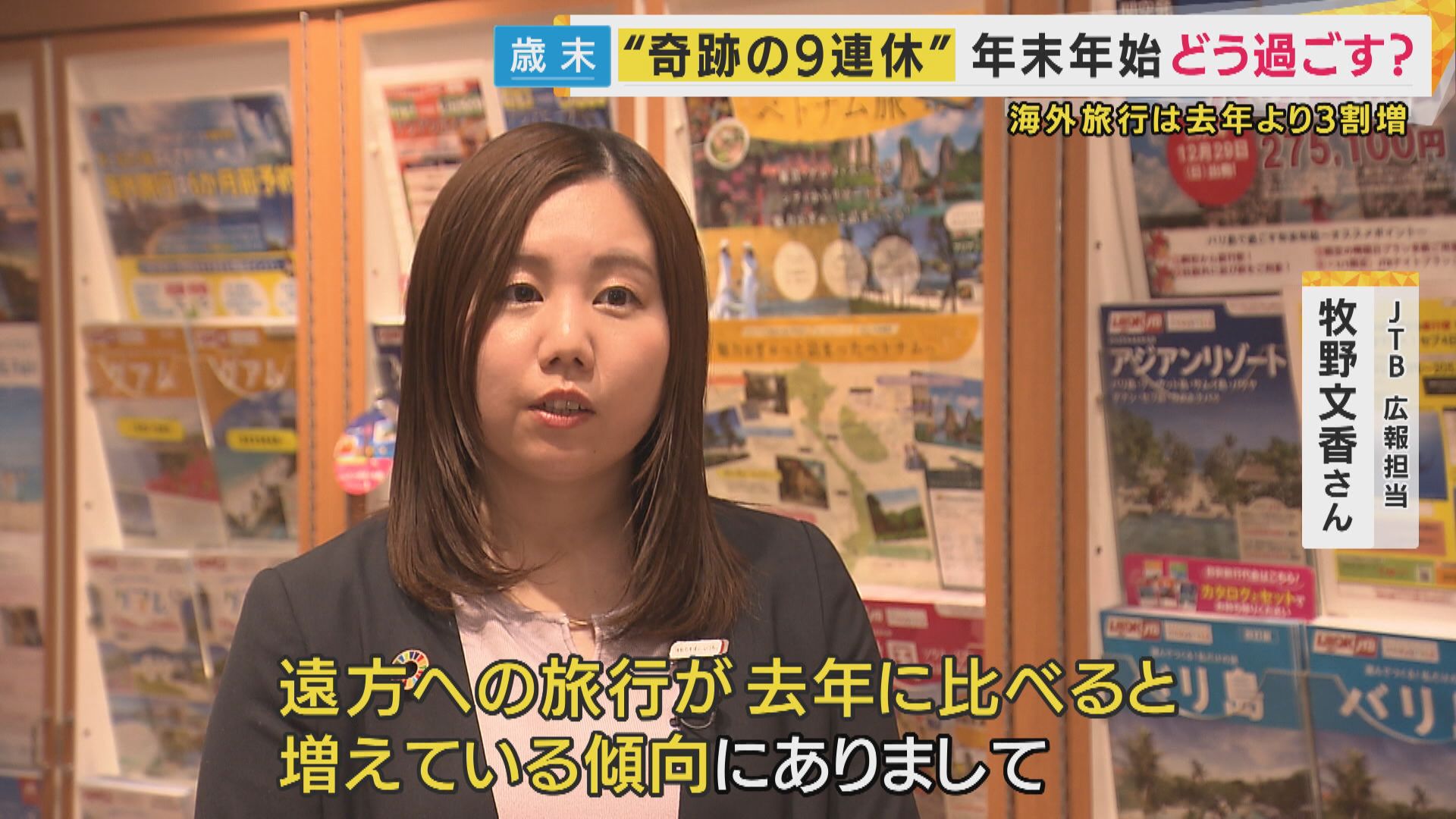 【JTB広報担当 牧野文香さん】「ことしは最大9連休ということもございましたので、夏休み明けてすぐぐらいの早い時期から、相談や申し込みいただいたお客さまが多くいました。遠方への旅行が去年と比べると増えている傾向にありまして、国内でしたら九州や沖縄、海外でしたらハワイやヨーロッパなどが人気になっています」