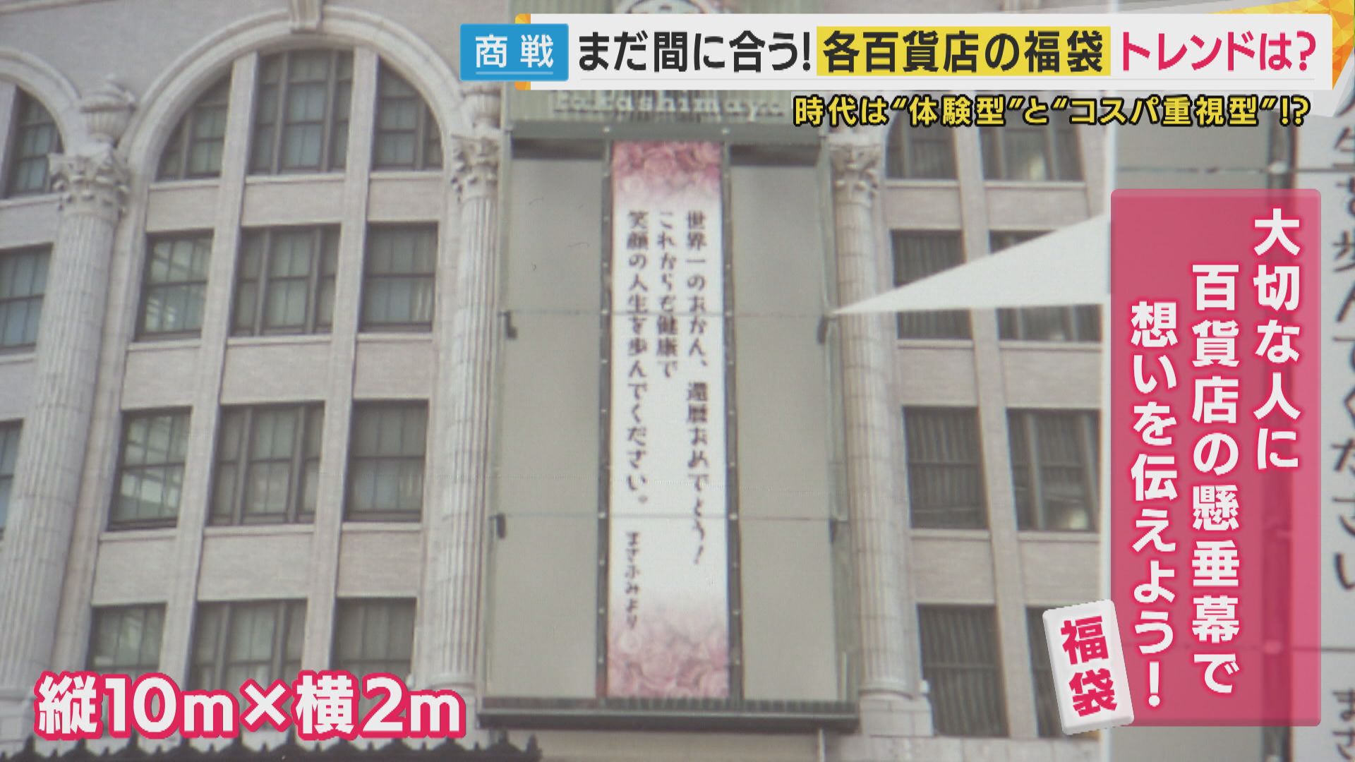 百貨店の入口に飾られた懸垂幕(縦約10メートル、横2メートル)に自由にメッセージを寄せられる福袋を、ことしに続き来年も用意。