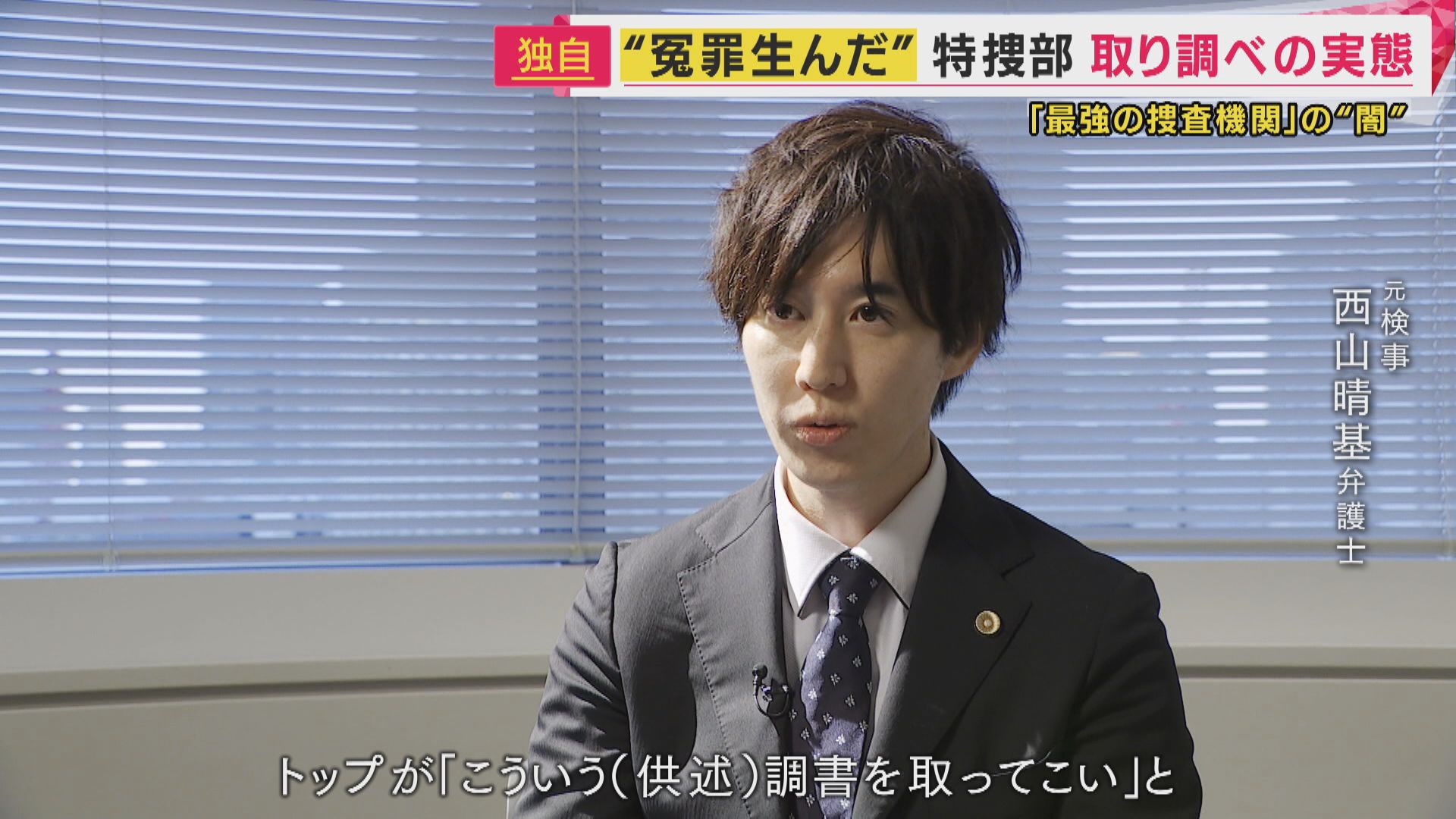【元検事(特別刑事部)西山晴基弁護士】「トップ(部長・主任検事)が決めたストーリーで、トップがこういう(供述)調書を取ってこい、と」 「その調書を取ってくるまでは毎日朝から夜遅くまで、取り調べから帰ってくるなと」
