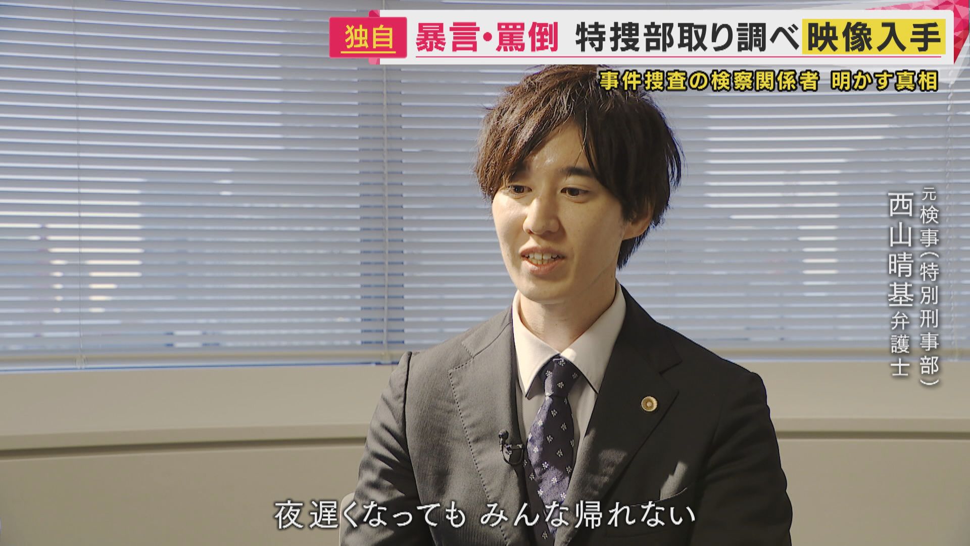 【元検事(特別刑事部)西山晴基弁護士】「自分の取り調べが終わっていても、他の検事は取り調べをしているから、夜遅くなってもみんな帰れない」