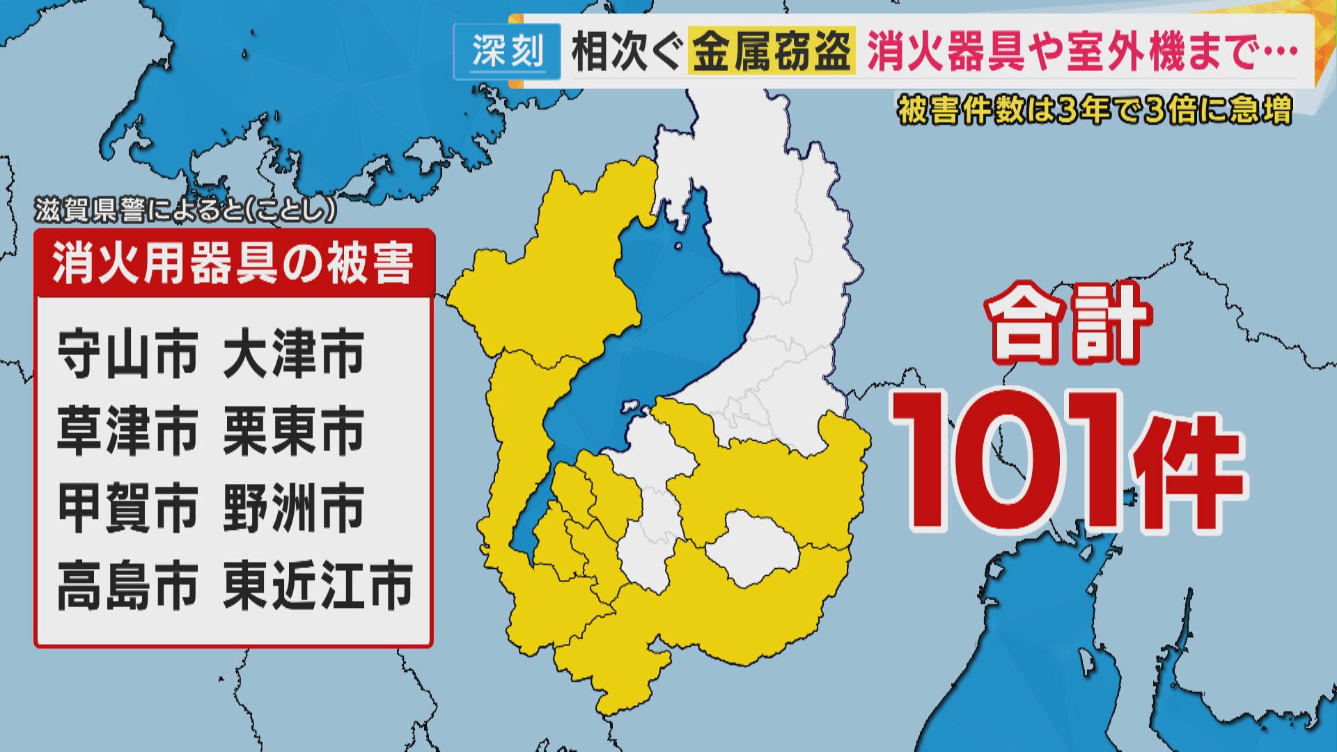 2024年に入り、消火用の器具を狙った被害は守山市だけでなく、大津市や草津市など少なくとも8つの市で、あわせて101件が確認されています。