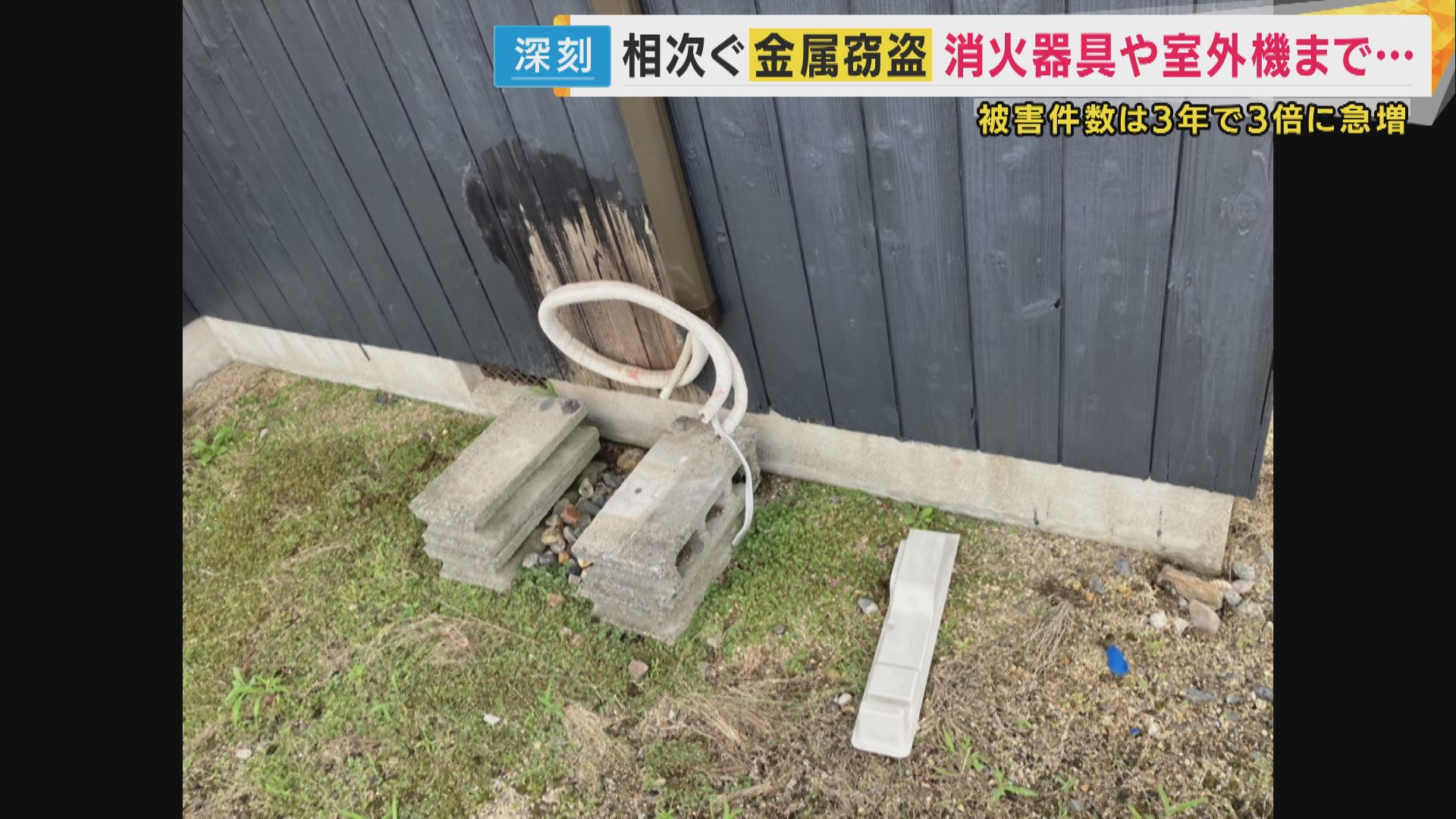 そして県内での窃盗被害は消火器具にとどまりません。 壁から垂れ下がった配管…無残に切断され、中には「銅」のパイプが… 滋賀県議会の小川泰江議員は2024年6月、「エアコンの室外機」を盗まれる被害に遭ったのです。