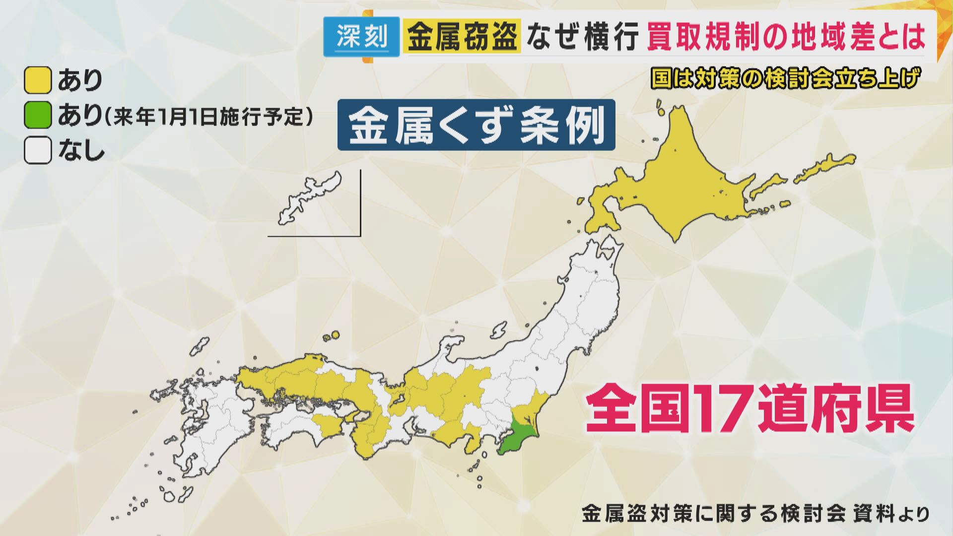【関西テレビ 神崎博報道デスク】「都道府県によってある県とない県がある中で、すべての都道府県で条例が制定されるのを待つかと言ったら、そうはいかないので、いま、国では一律に統一で金属の売買を規制しようという動きがあります。国として法律ができれば、全国一律で売買が厳しくなるので、それを国としてはやろうとしているところです」