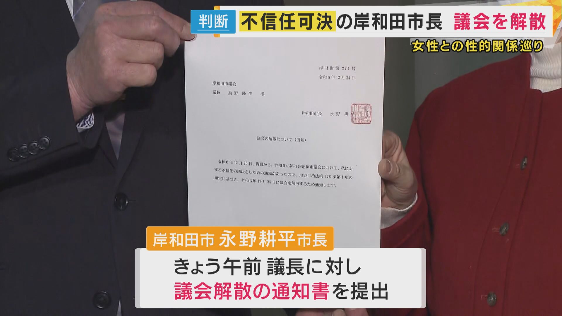 「議会解散」か「失職」か―。 市長は12月30日までに選択を迫られていましたが、24日、議会を解散する通知書を議長に提出したのです。