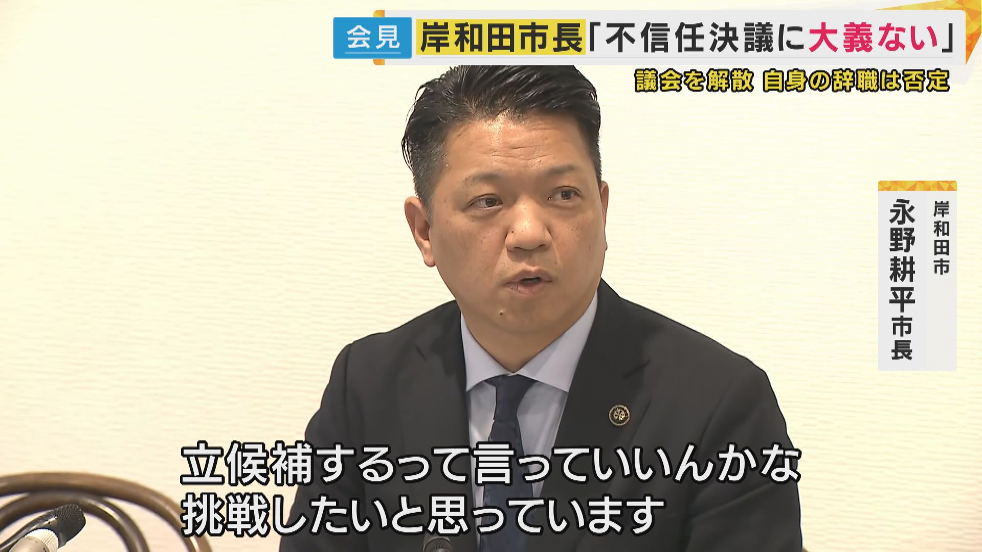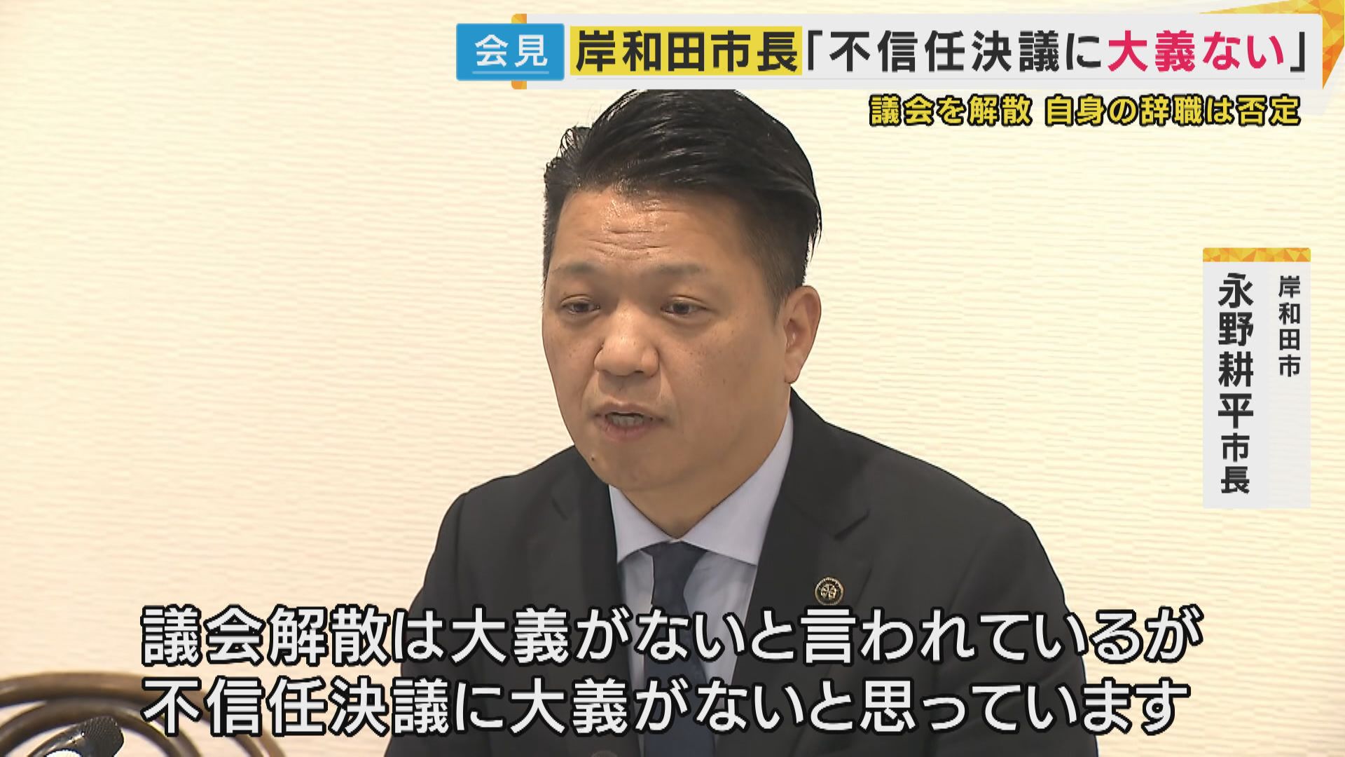 【岸和田市 永野耕平市長】「本日、岸和田市議会に対しまして、午前10時ぐらいに解散をいたしました。議会の解散は大義がないと言われてるんですけど、この不信任決議に大義がないと私は感じていますので、あとは市民の皆さんに決めていただく他ないと思っています」