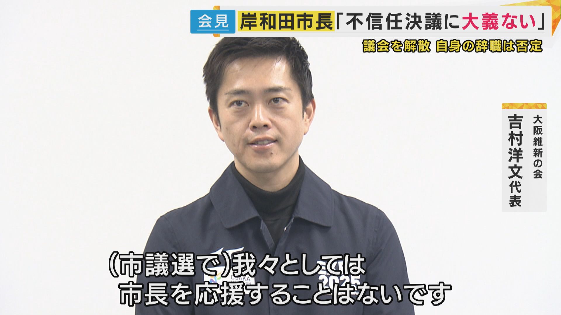 【大阪維新の会 吉村洋文代表】「(議会の)解散の大義があるとは思えない。何が争点になるかというと、真実が分からないので。(市議選で)われわれとしては、市長を応援することはないです」