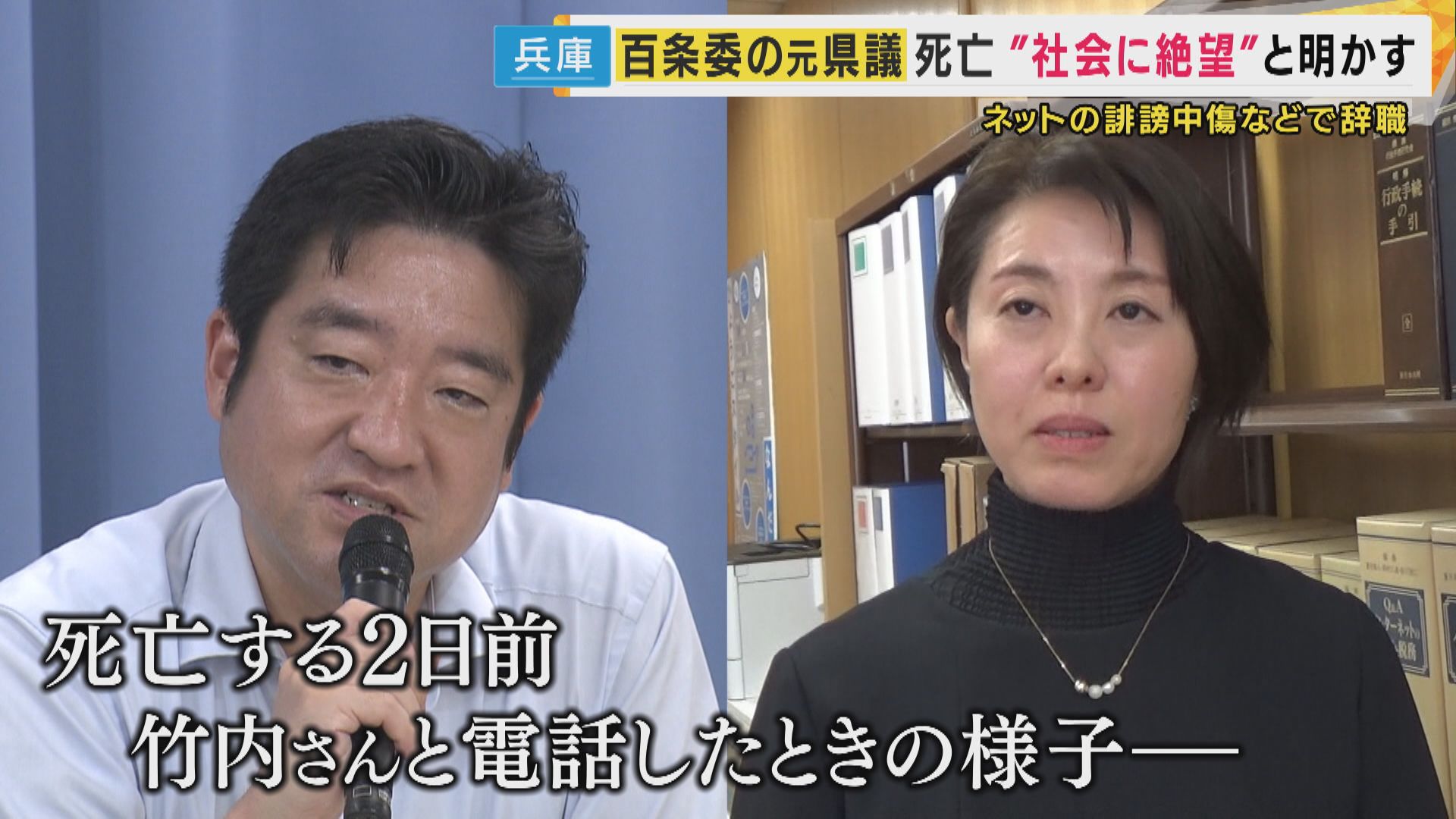 竹内さんは、斎藤知事の疑惑を調査する県議会の百条委員会の委員を務めていましたが、去年、ネット上での激しい中傷などを理由に、議員を辞職していました。