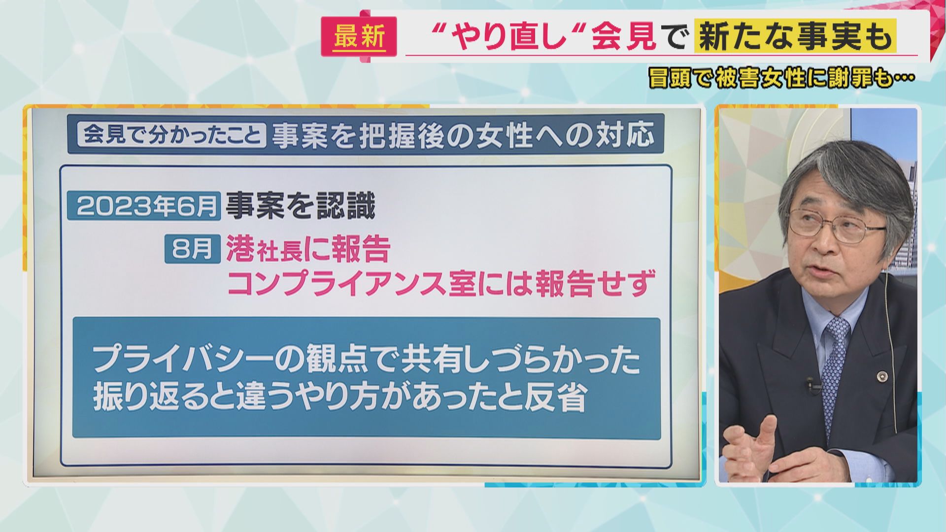 【共同通信社編集委員 太田昌克さん】「今日会見を聞いて一番印象に残ったのが、港社長が『人権侵害の疑いはあると思って対応している』と言っているんです。当時すでに人権侵害の疑いがあると思ってやっていたのかどうかまでははっきりしないのですが、これは相当人権に触れる話だという認識はあった。8月の報告を受けて」
