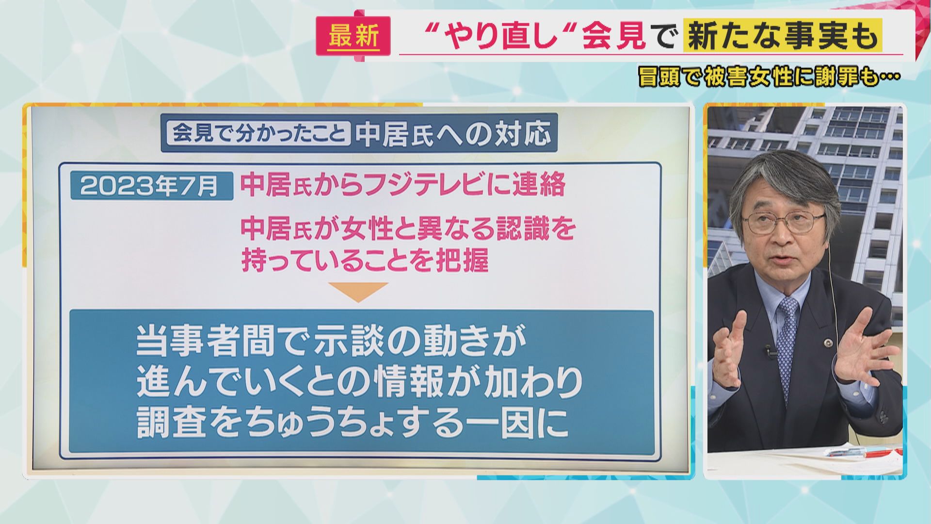 そして2023年7月に、中居氏からフジテレビに連絡があったということで、中居氏が女性と異なる認識を持っていることを把握。