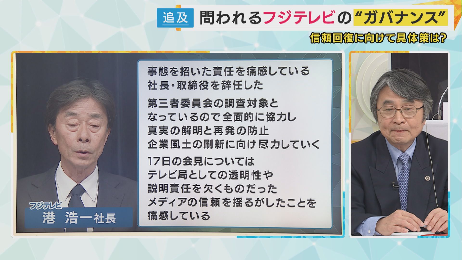 【フジテレビ 港社長】「事態を招いた責任を痛感している。社長・取締役を辞任した。第三者委員会の調査対象となっているので、全面的に協力し、真実の解明と再発の防止、企業風土の刷新に向け尽力していく。1月17日の会見については、テレビ局としての透明性や説明責任を欠くものだった。メディアの信頼を揺るがしたことを痛感している」