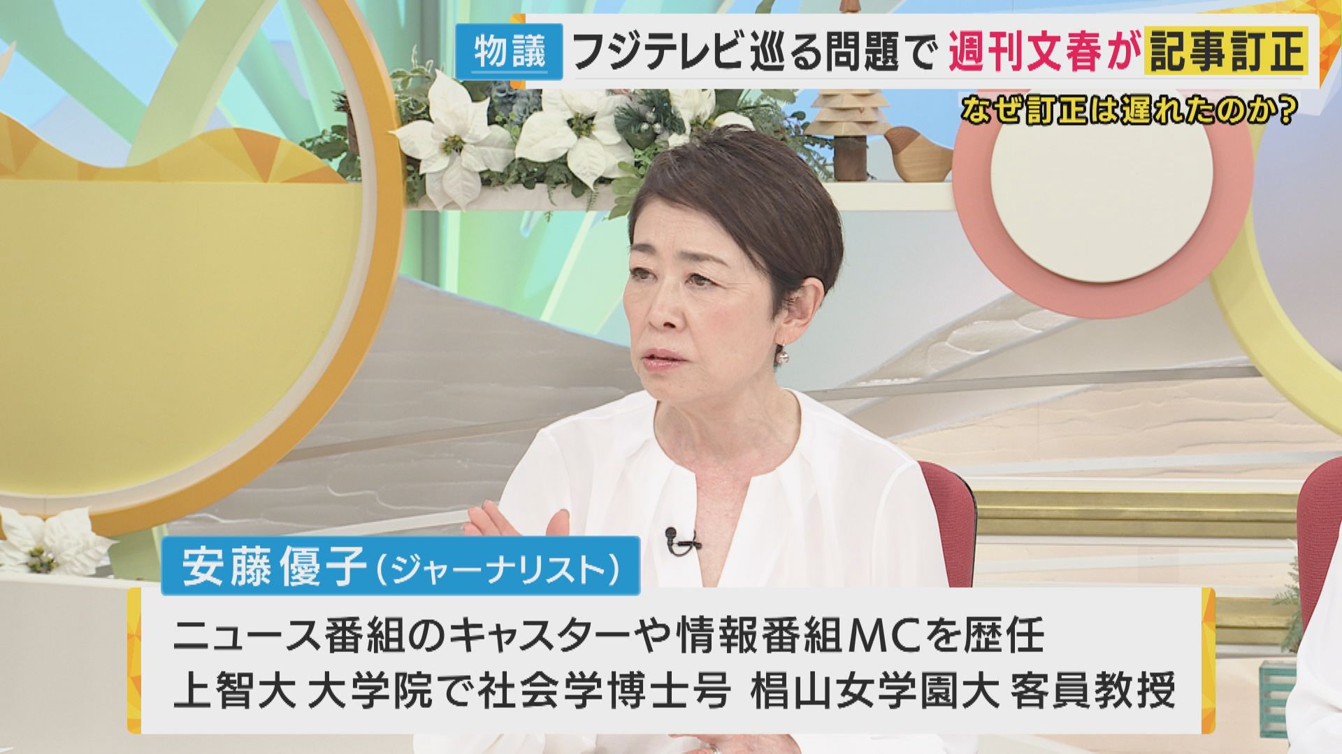 【安藤優子さん】「文春の訂正記事にある”延長”という表現が気になりました。『編成幹部A氏がトラブルに関与した事実は変わらない』とあるが、トラブルに実際に関与した事実は変わらないですか?ちょっとこれは矛盾している」
