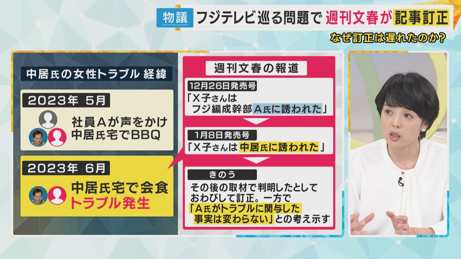 週刊文春は今回の訂正に関して、「『X子さん(中居氏とトラブルになった女性)はフジ編成幹部A氏に誘われた』としていました。しかし、その後の取材により『X子さんは中居氏に誘われた』『A氏がセッティングしている会の”延長”と認識していた』ということが判明した」と説明しています。